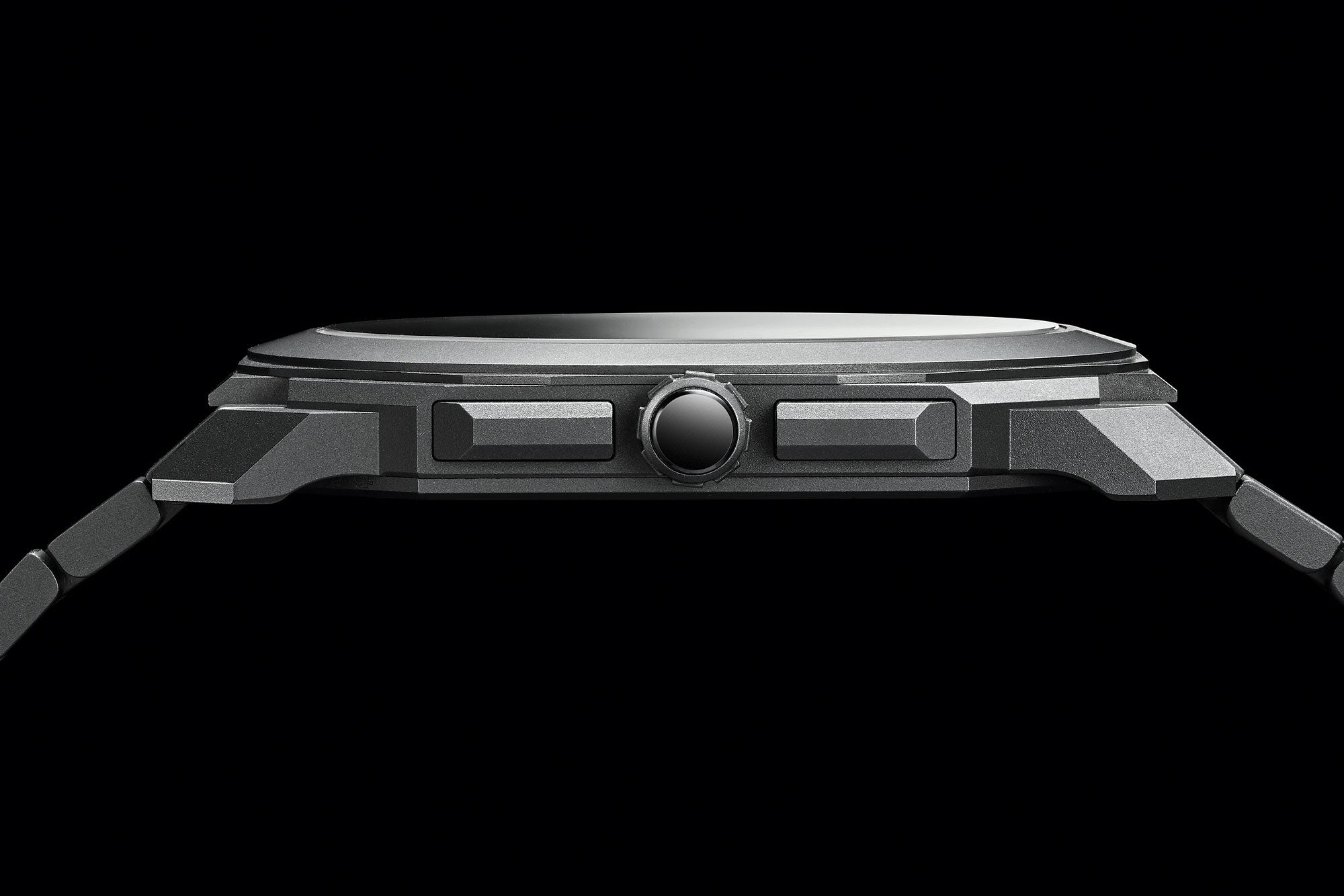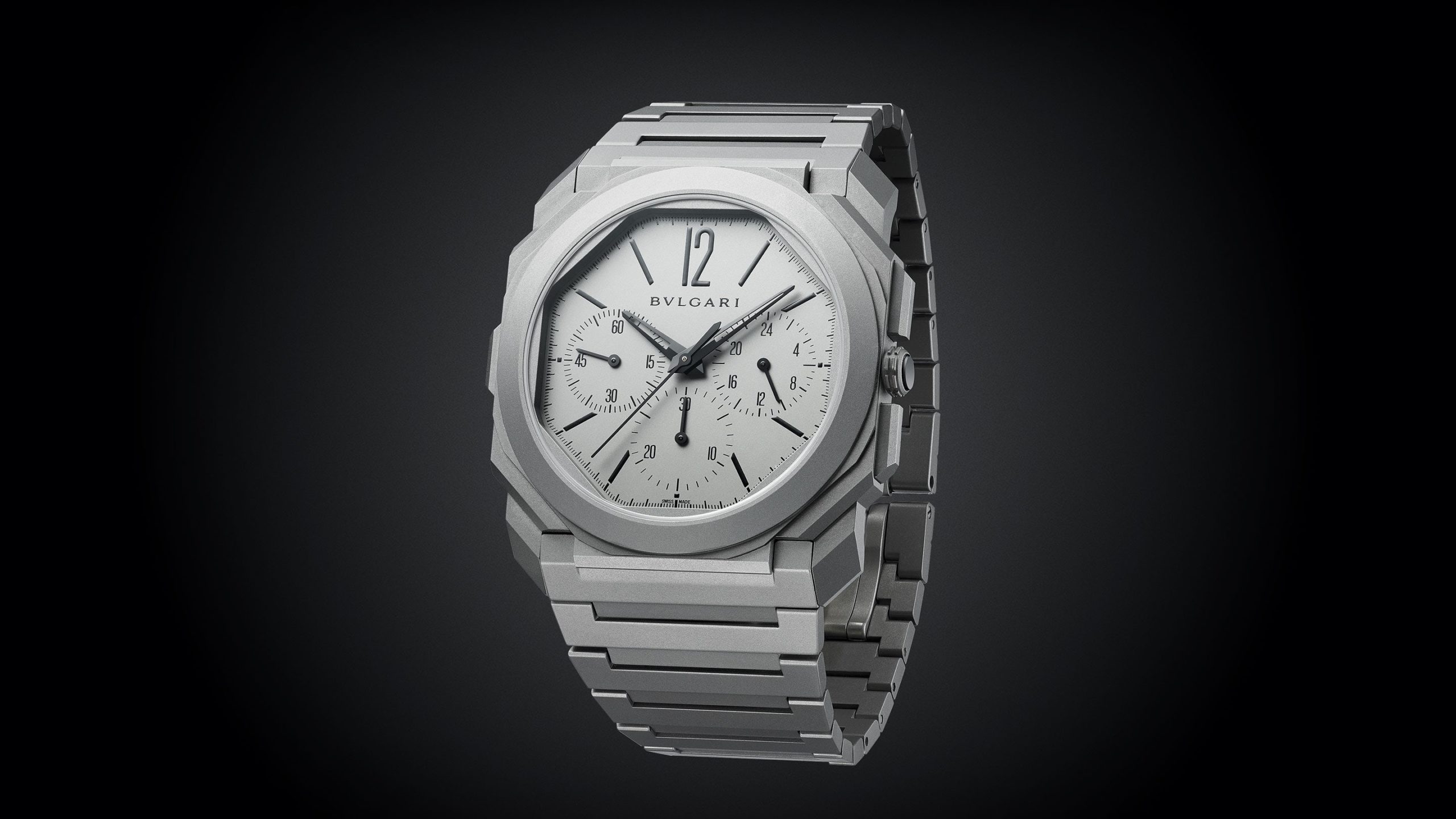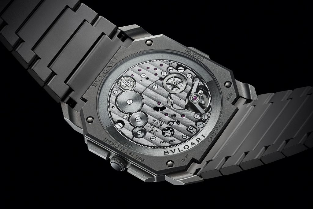 Let’s look at the previous super thin record holder. Until now, the world’s thinnest chronograph watch was the Piaget Altiplano Chronograph, which has a manually wound chronograph movement that’s 4.65mm thick, inside a case that’s 8.24mm thick. The new Octo Finissimo GMT chrono combines not only a chronograph and a GMT indicator but also an outer winding rotor. The movement is 3.3mm thick, and the case 6.9mm at its thickest point.