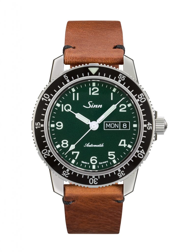 This watch is the quintessential pilots watch according to Sinn, it has a shimmering green dial, day and date indications and a bi-directional pilot’s bezel. This watch also has a sapphire crystal on the front and back and is pressure resistant to 20 bar, as well as being low pressure resistant as well although no figure was given for that. Inside it is an ETA 2836-2 movement, and it’s limited to just 500 pieces.