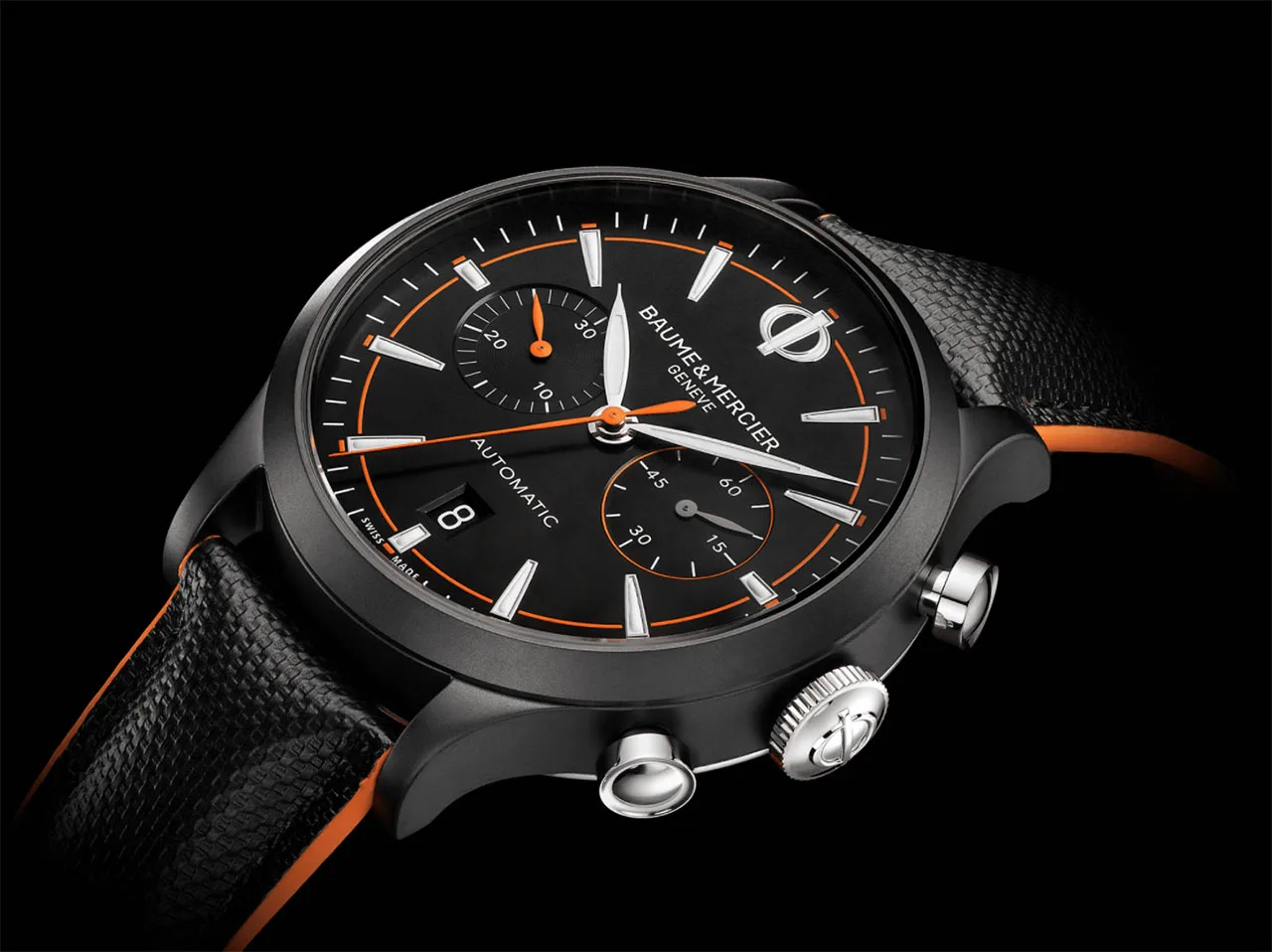 The new Baume and Mercier Capeland chronograph watches would come attached to a black calfskin strap with orange edges. Both the full DLC variant (Reference 10452) and the semi DLC variant (Reference 10451) would cost USD 3,550.