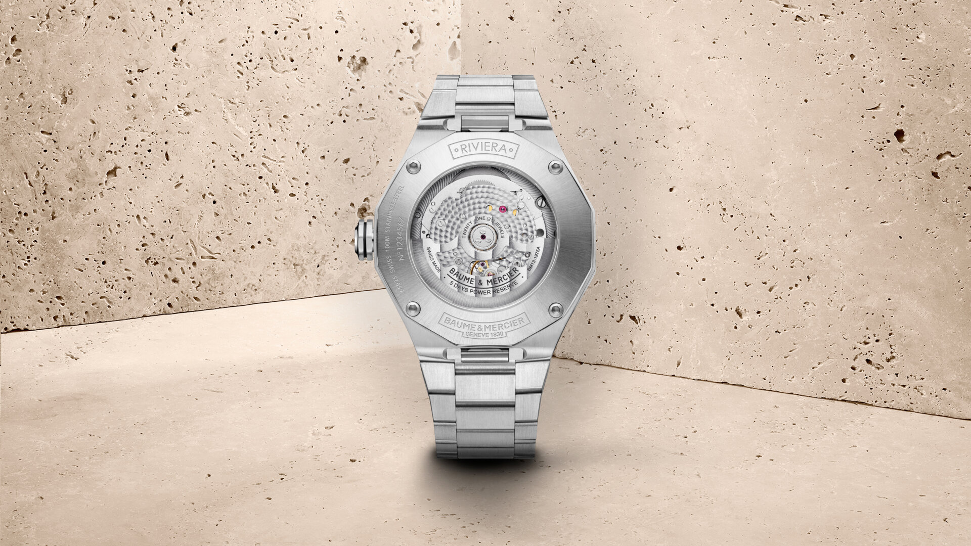The Riviera 10702 has a 42mm stainless steel case that’s just 10.7mm thick, offering a modern yet manageable size for most wrists. Water-resistance is rated at 100 meters, so “sport” is an honest description beyond the looks. The brushed 12-sided bezel with a polished chamfer features four exposed hex screws in the same vein as many popular sports watches, but it’s clearly a Baume & Mercier design. The 8-sided crown features a groove in the middle, adding a subtle touch of style, while the dodecagonal exhibition case back is secured via four matching hex screws. The integrated steel bracelet is mostly brushed with some polished accents and features a hidden folding clasp and quick release system. There are sapphire crystals front and back with anti-reflective coatings.