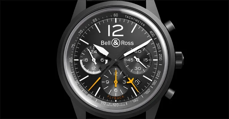 Orange –reserved for essential information–also has an important presence and, having always featured on the dials of the Bell & Ross Vintage collection, has become emblematic of the brand. In order to promote the most important information, a touch of orange makes all the indications linked to the chronograph function stand out in contrast against the matte black.