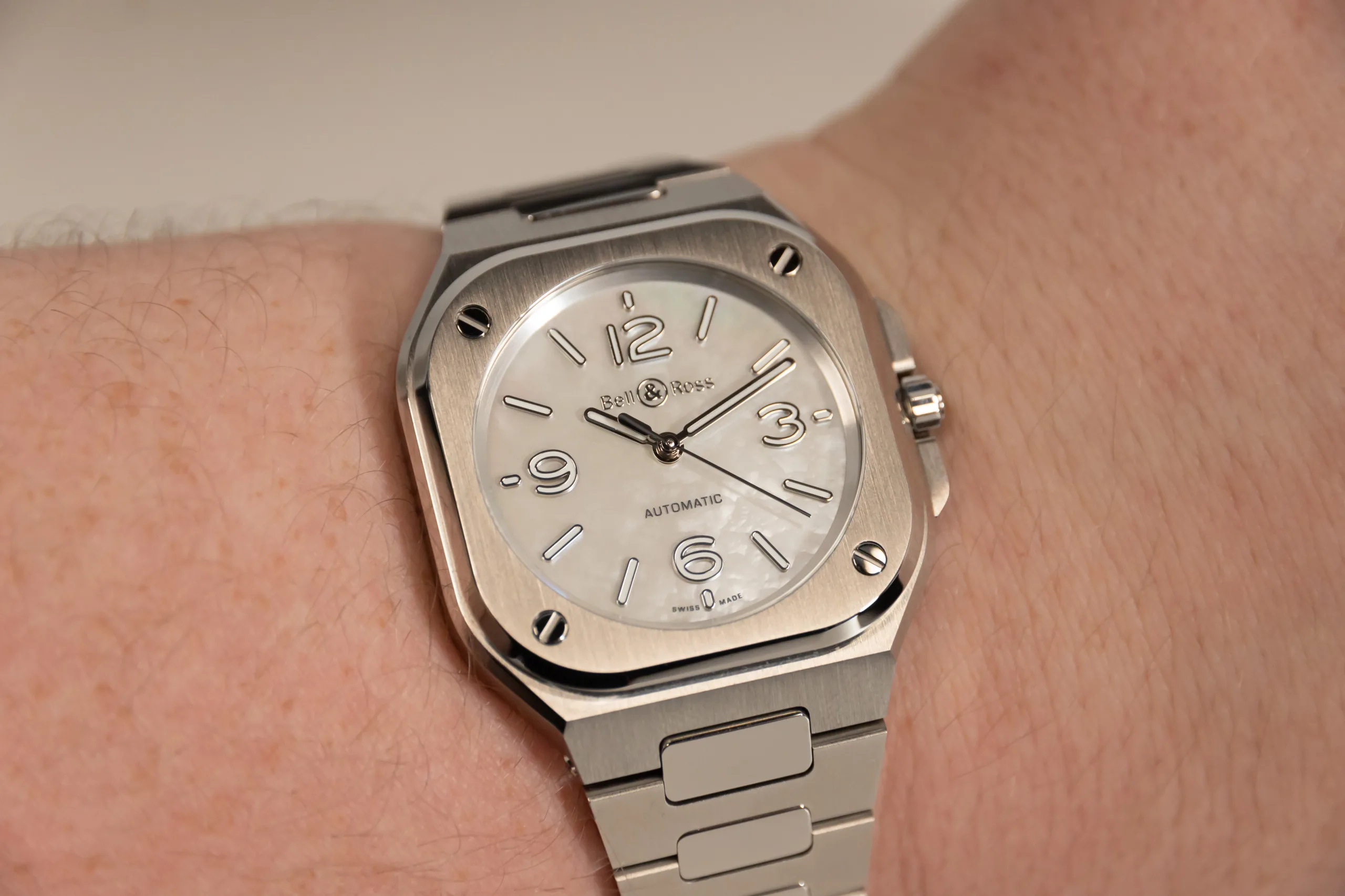 Four new watches are coming to the market soon, of which three we have pictures of. There’s your classic black dial watch, a fetching silver dial version, the mother of pearl which is my favourite, and the last one which we don’t have live photos of is the blue dial version. All of these watches are clean and easy to read with SuperLumiNova for night reading too. All the watches have the self-winding calibre BR-CAL.329 inside which has a 54-hour power reserve. All watches are 100m water resistant.