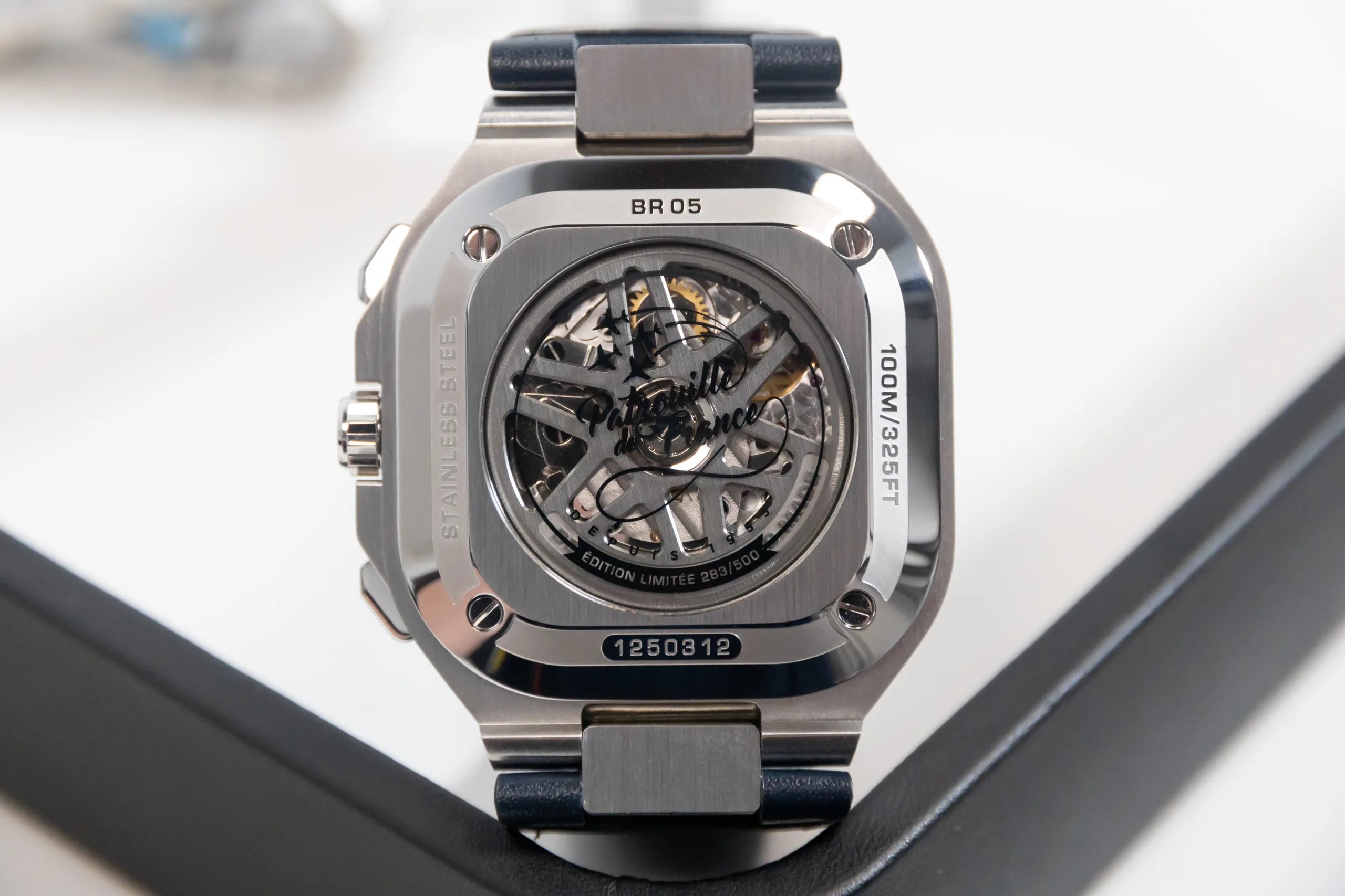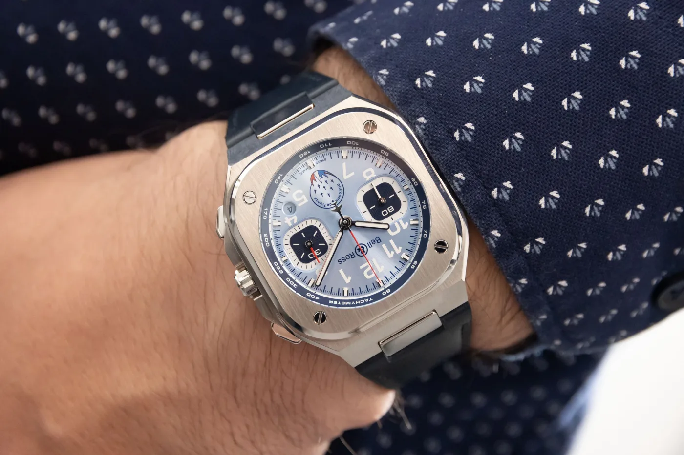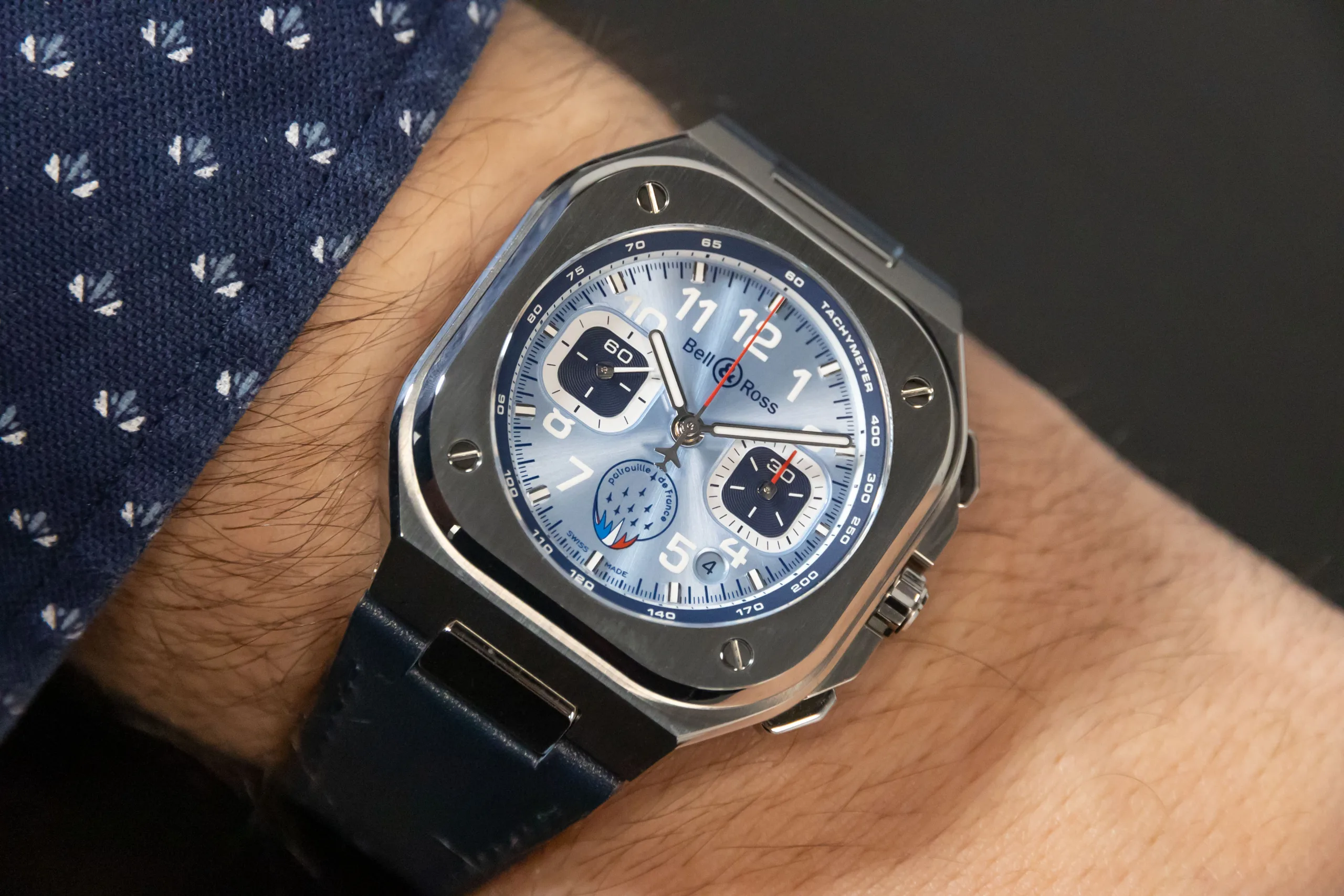 The last watch celebrates France’s aerobatic display team, the Patrouille de France. The sky blue dial with red and white details matches the team’s colours and accentuates the bold design they went for. The BR-05 Chrono is not new, of course, but it’s easy for Bell & Ross to re-work its design to look brand new; some watches just end up looking awkward.