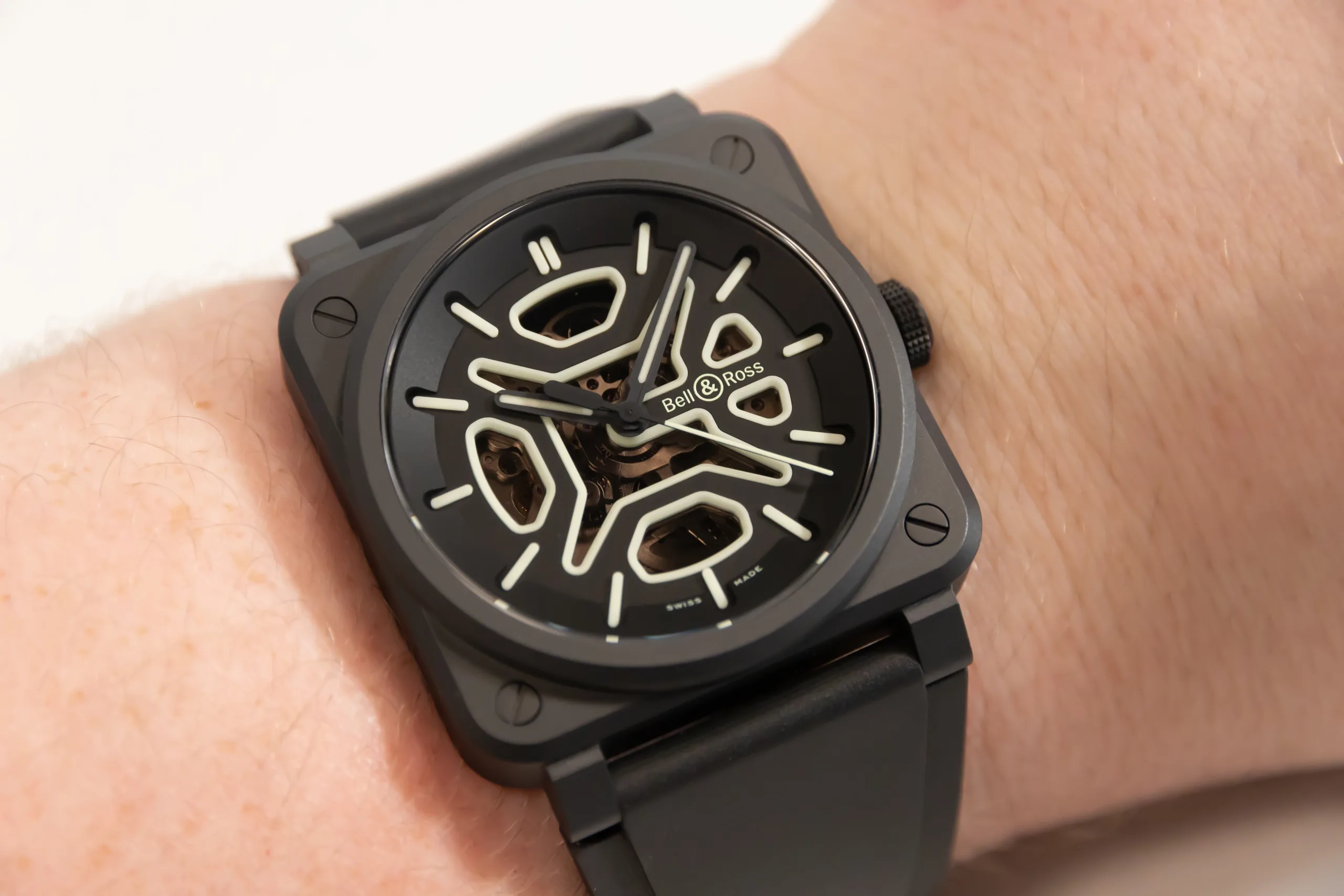 The BR-04 Skeleton Lum Ceramic is the most unique watch of the three, thanks entirely to Bell & Ross’ enthusiasm for SuperLumiNova. They’ve applied it to the dial in such a way that it enhances the already interesting appearance of the dial. It loses the huge Arabic numerals and wide hands, but it gains that interesting appearance. This watch is also made from ceramic but this time measures 41.00mm x 11.25mm, I have no idea why this one is thicker still, but the wide rubber strap means it’s comfy on the wrist. The price is £5,900 with VAT, and in the US it’s $6,600.
