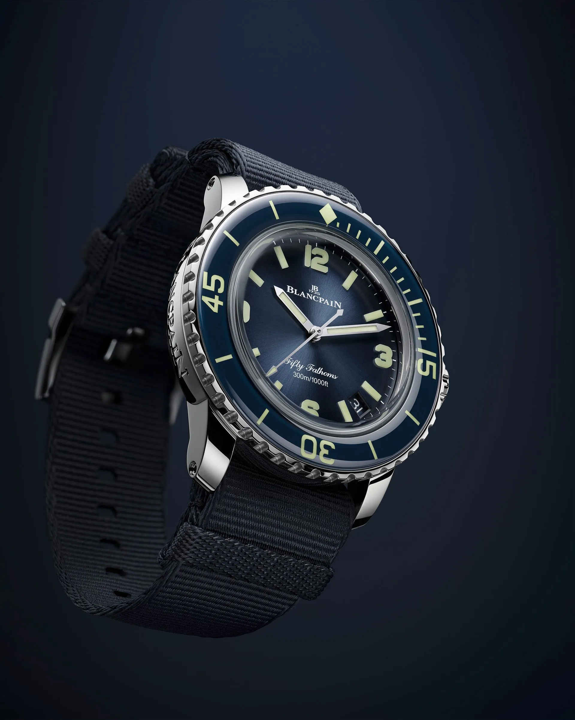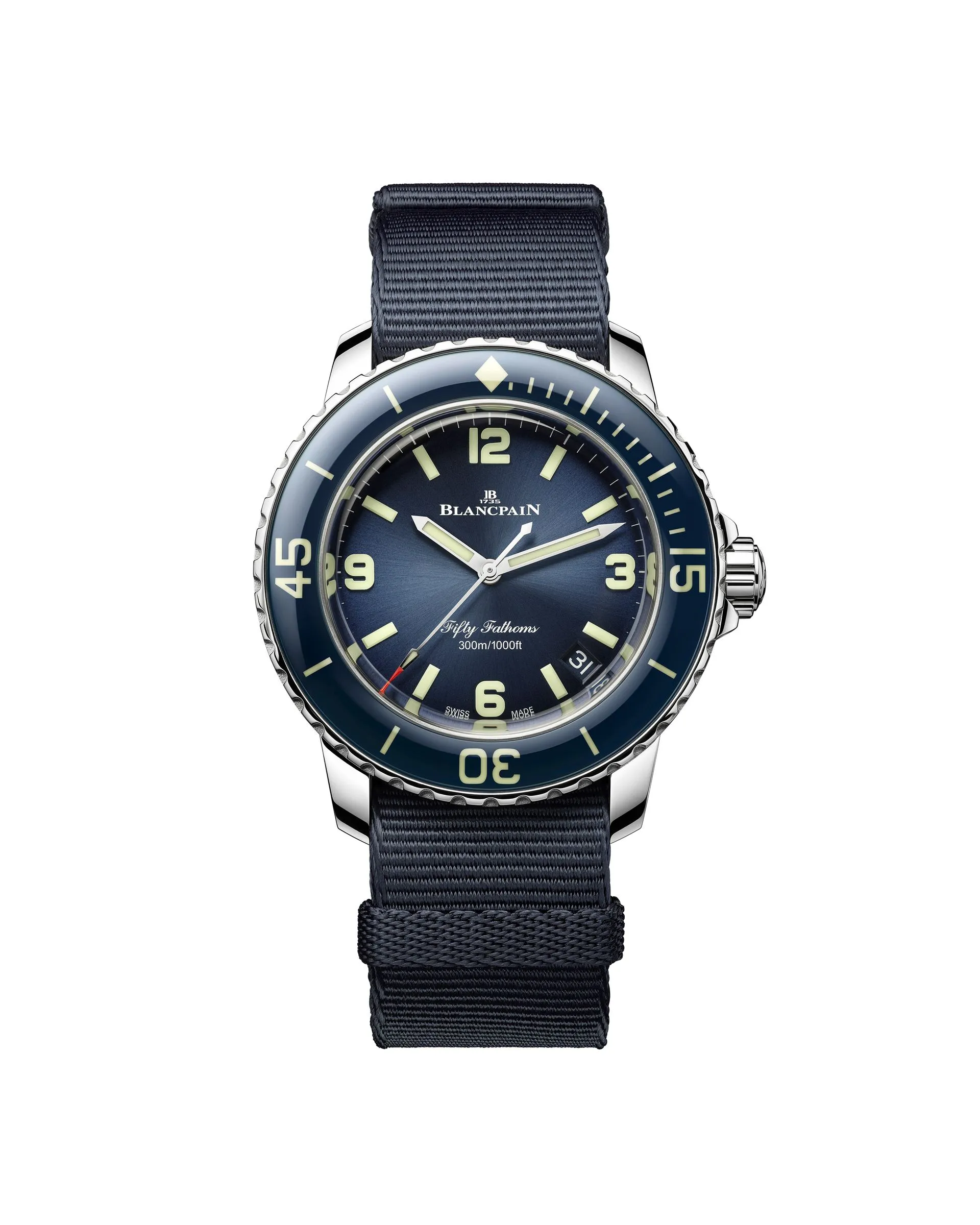 The blue NATO-style strap is made of nylon salvaged and recycled from fishing nets retrieved from the water as part of ocean environmental cleaning initiatives.