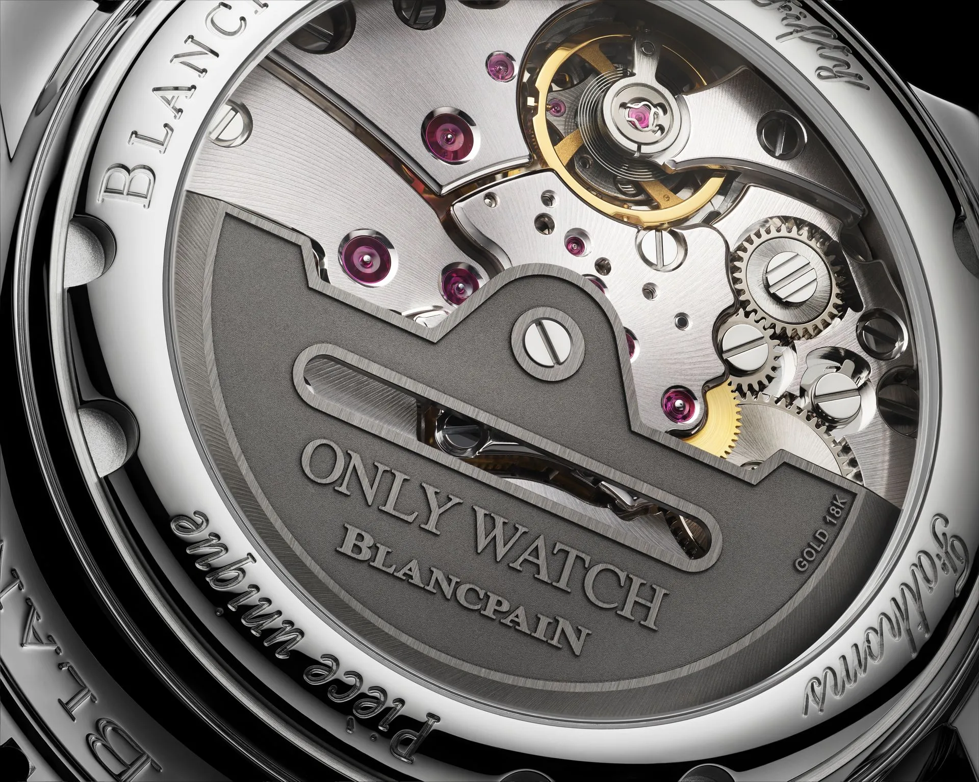 The Blancpain calibre 1315 is therein, with three mainspring barrels providing a 5-day power reserve. For improved precision and robustness, the movement moreover has a free-sprung balance with a silicon hairspring. The transparent caseback reveals the movement’s high-end finishing, including extra-large jewels and an 18K gold winding rotor coated in a NAC platinum-based alloy and inscribed with the Only Watch legend.