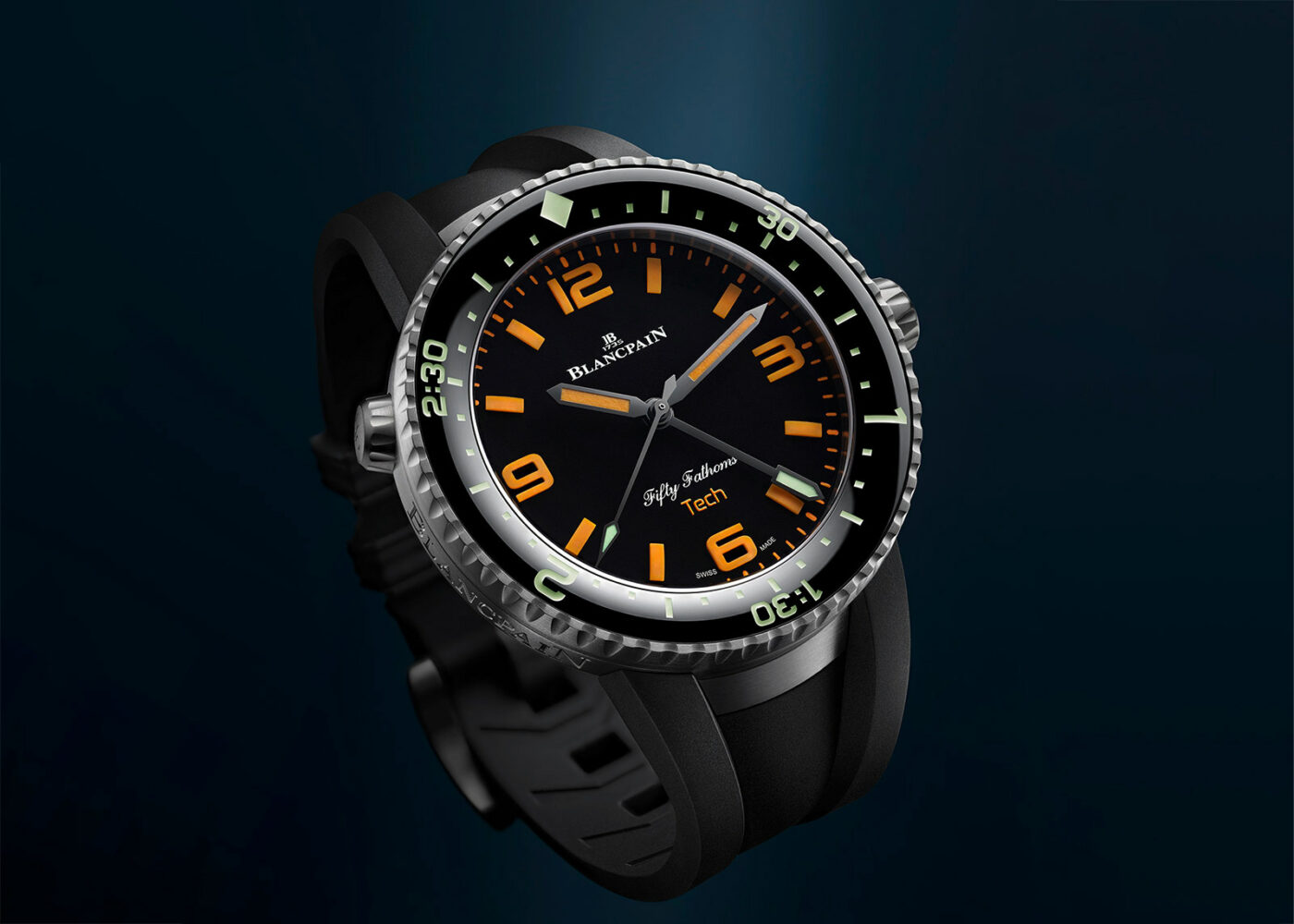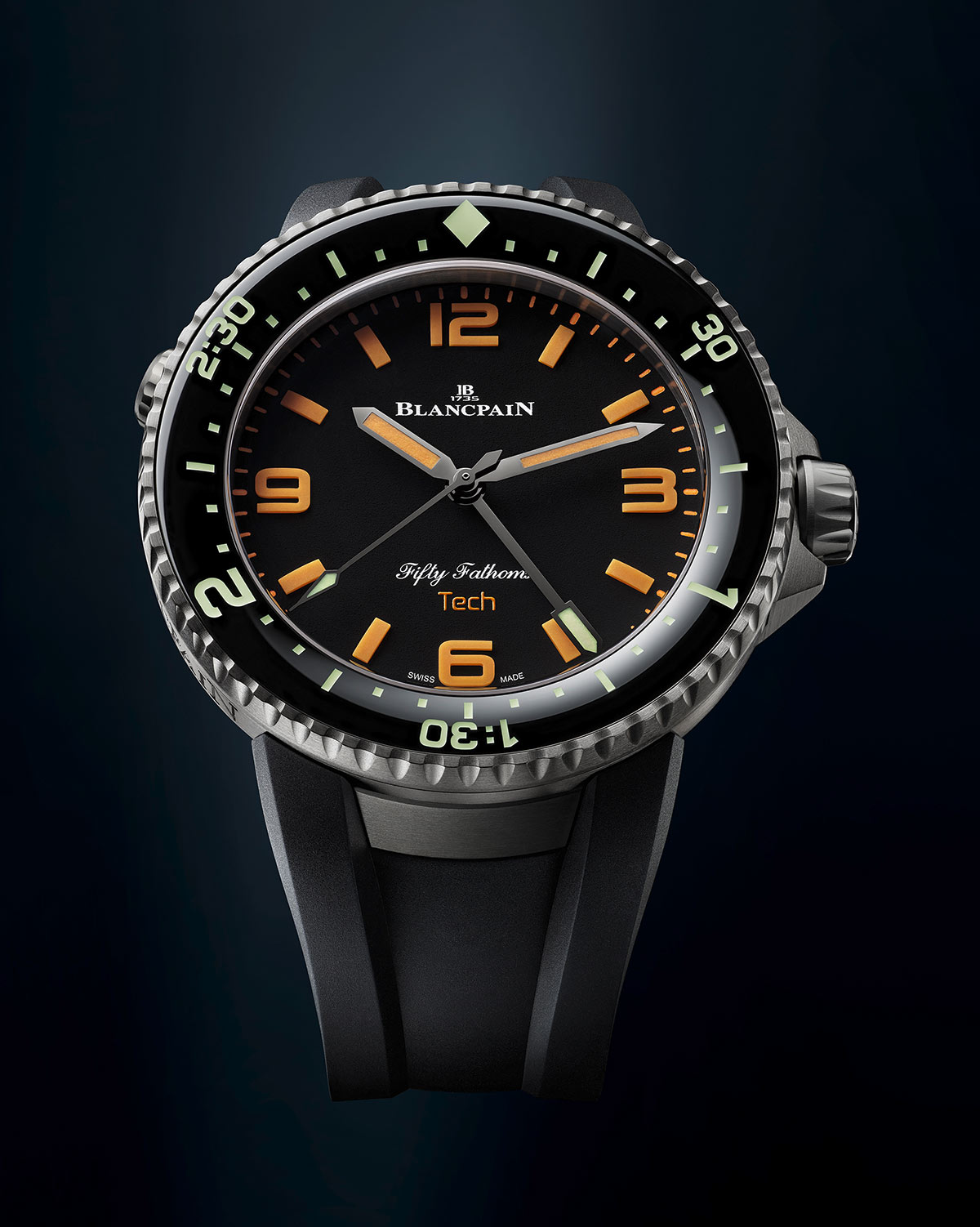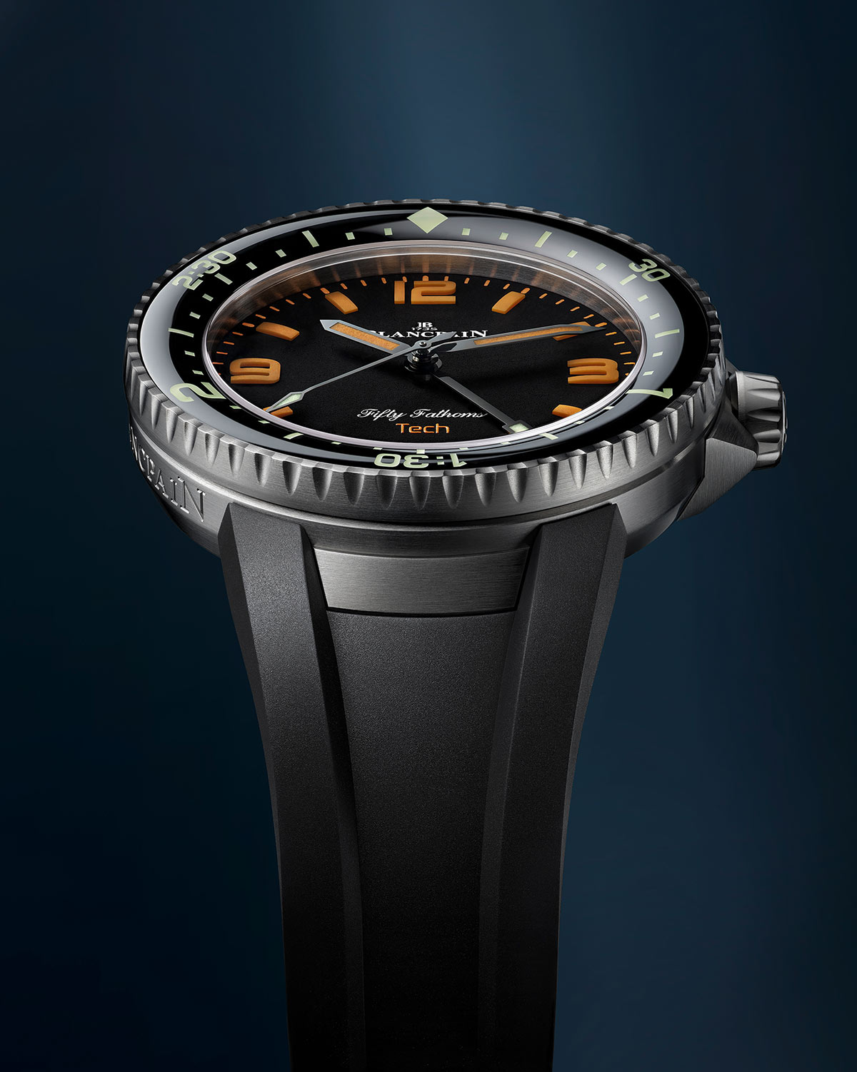 The case of the watch is crafted from Grade 23 titanium, the purest type available. It is 47 mm x 14.81 mm, making it remarkably light despite its imposing size. The case is water-resistant to 300 meters and is equipped with a helium valve. The bezel on the Fifty Fathoms Tech Gombessa has a three-hour scale and is linked to a special hand that completes one full turn in three hours, a world first for which a patent has been filed. The dial is finished in absolute black and is able to capture 97% of the light for maximum readability in the dark. The hour-markers are formed by luminescent block-shaped appliques in orange with blue emission.
