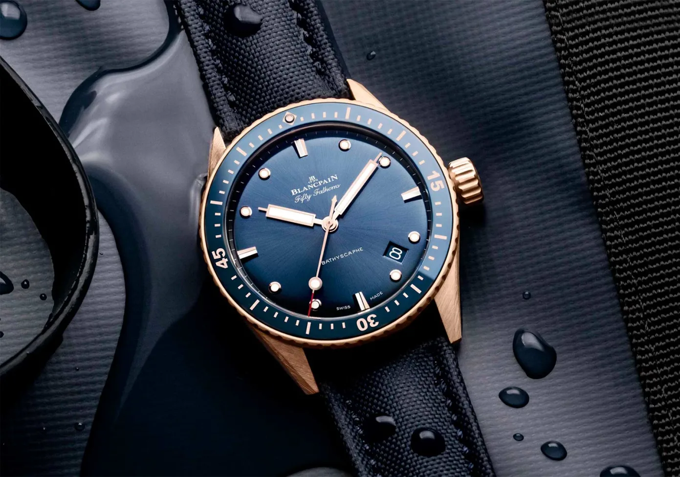 The new Blancpain Fifty Fathoms Bathyscaphe Blue Sedna Gold can be purchased on either a rugged blue sailcloth strap or a blue nato strap. The retail price for the watch has been set at EUR 23,840.