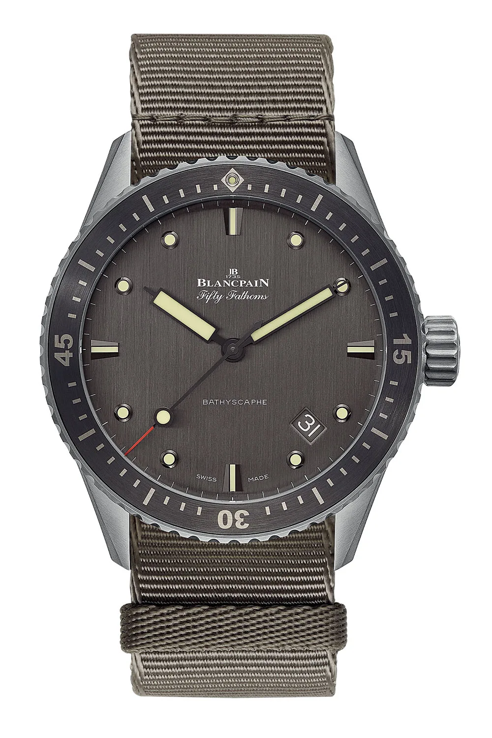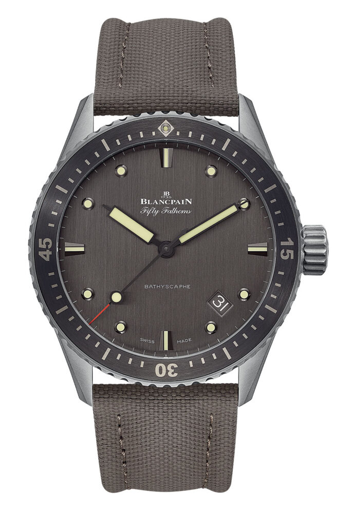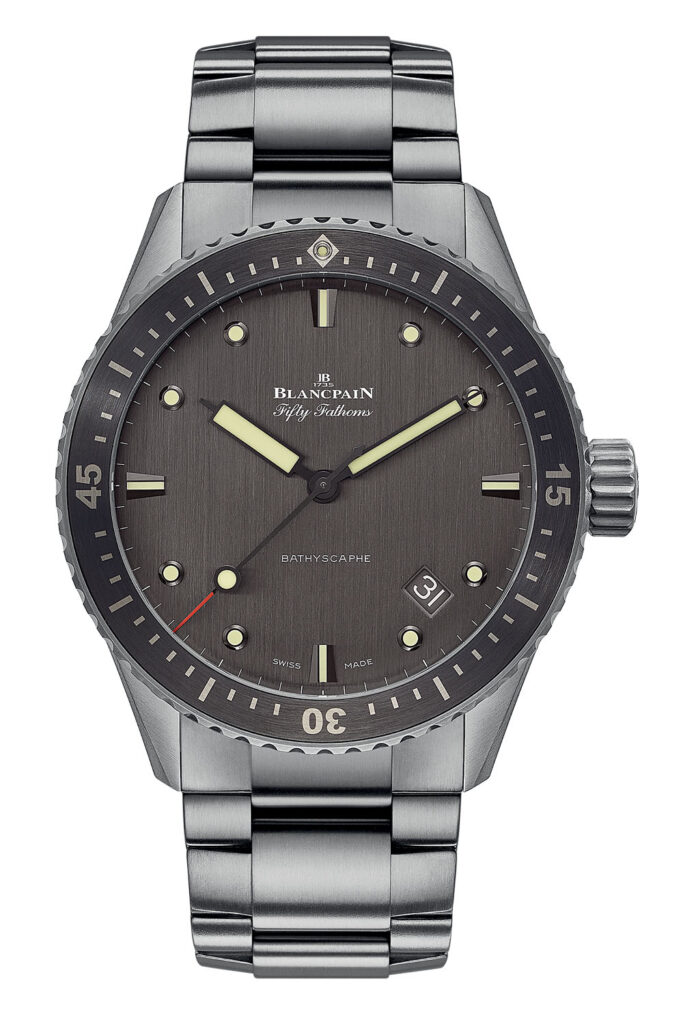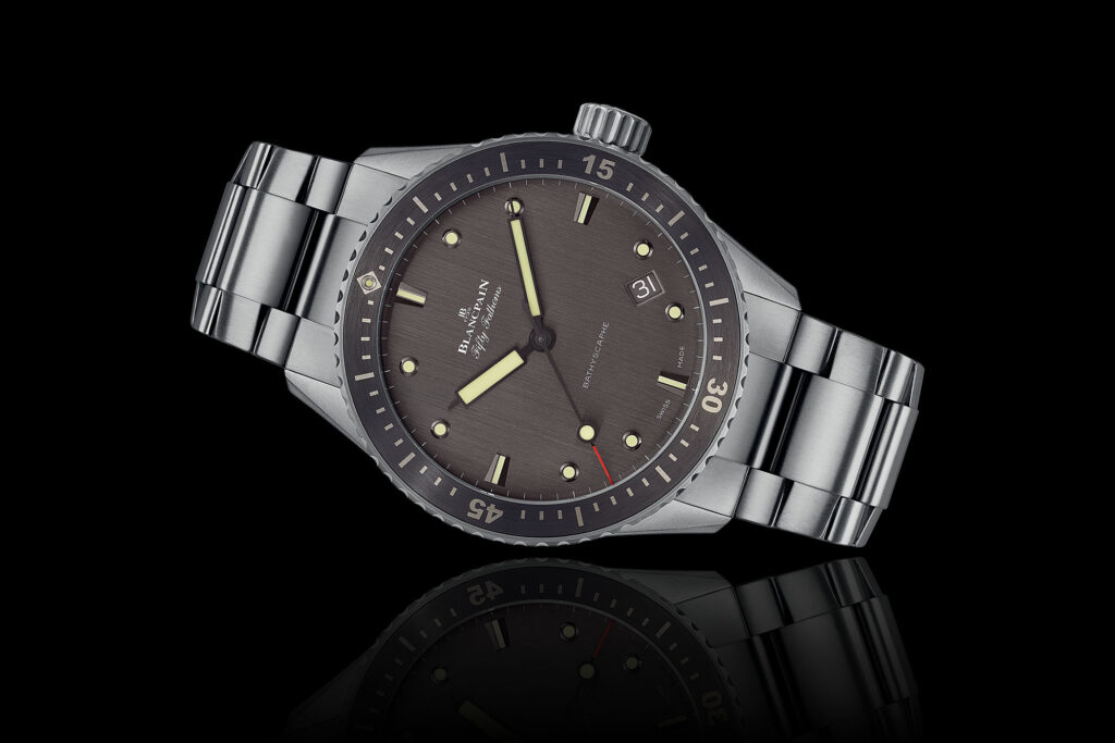 The dial is coloured anthracite grey and has a vertical brushed finish with applied markers and plenty of SuperLumiNova. Said lume appears to be coloured like it’s patinated. Whether you think fauxtina is a good thing or not is up to you. A date window has been fitted at 4.30, I’m not sure what’s stopping Blancpain from putting it at 6 O’clock, but it’s not offputting where it is. Wrapped around the dial and crystal is a unidirectional rotating bezel suitable for diving. It’s a Liquidmetal bezel, which means it’s a ceramic base with the numbers cut out and melted metal forced in, bonding the two materials to become one bezel. It was developed by Blancpain’s Swatch Group cousin Omega for their Seamaster Planet Ocean, but it’s not a detriment to this watch in the slightest.