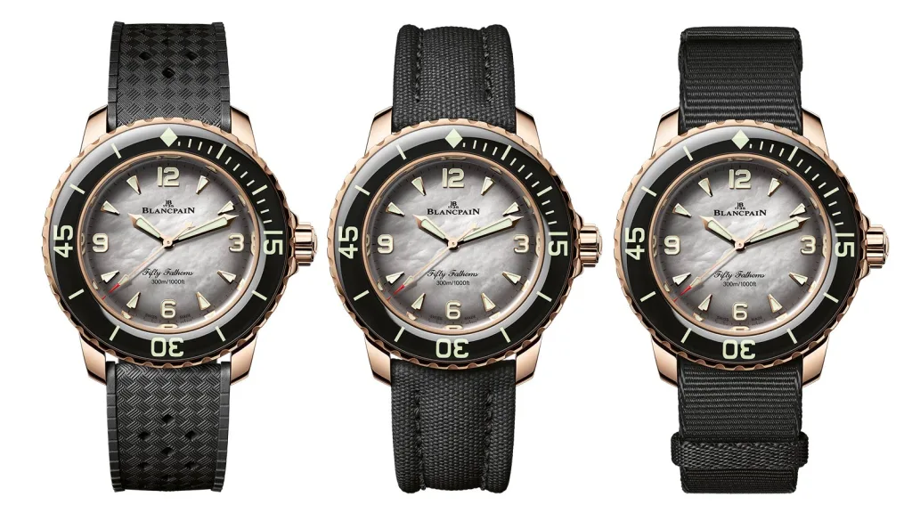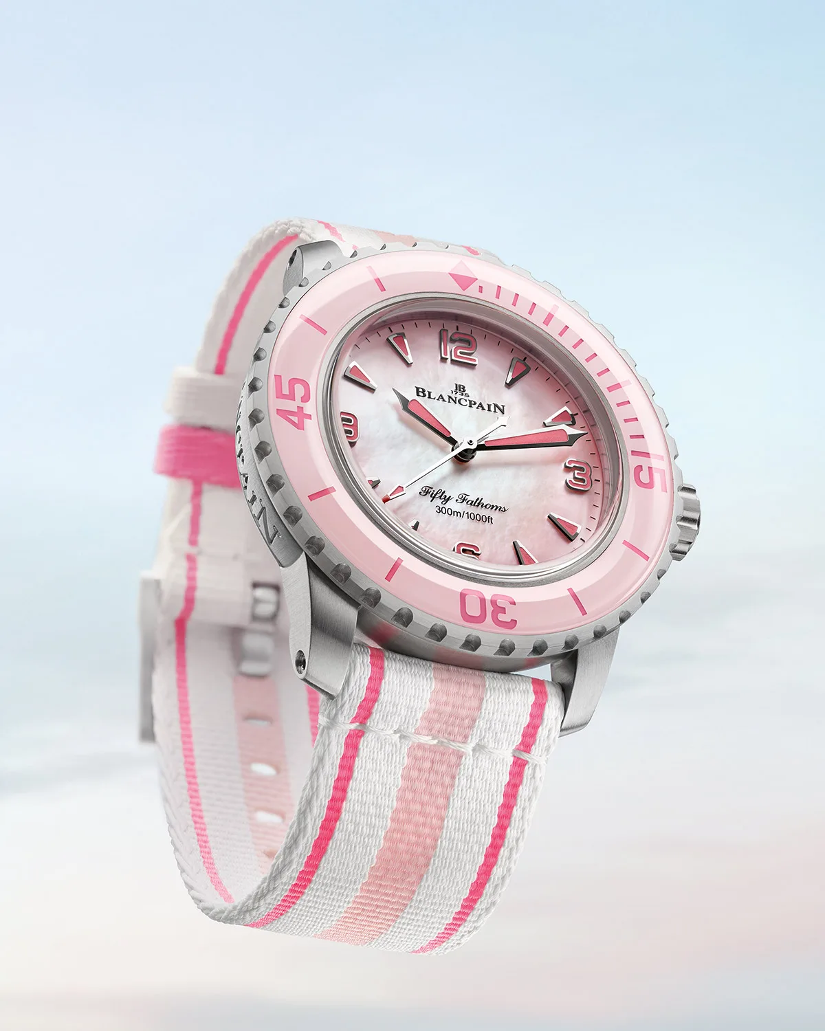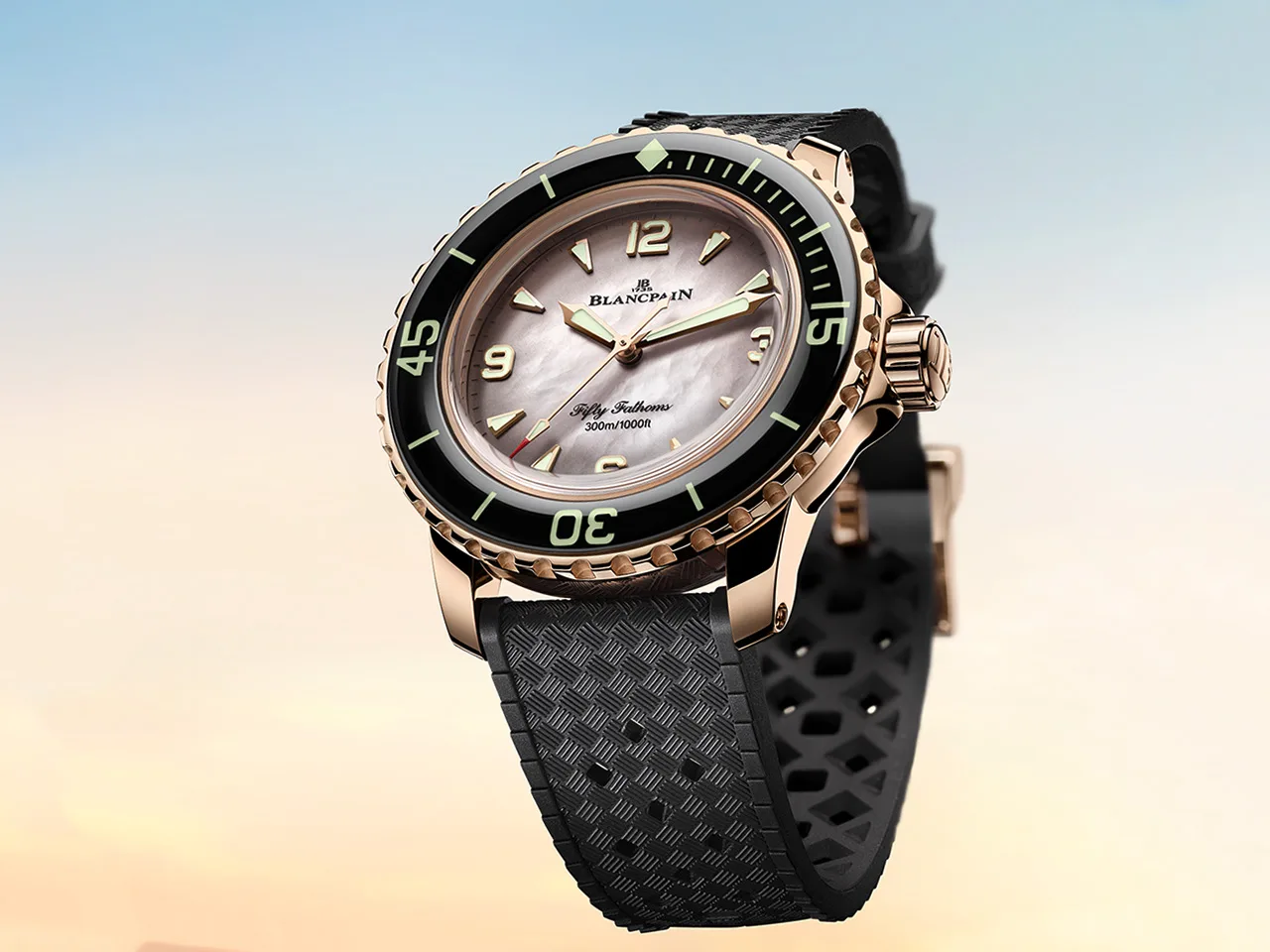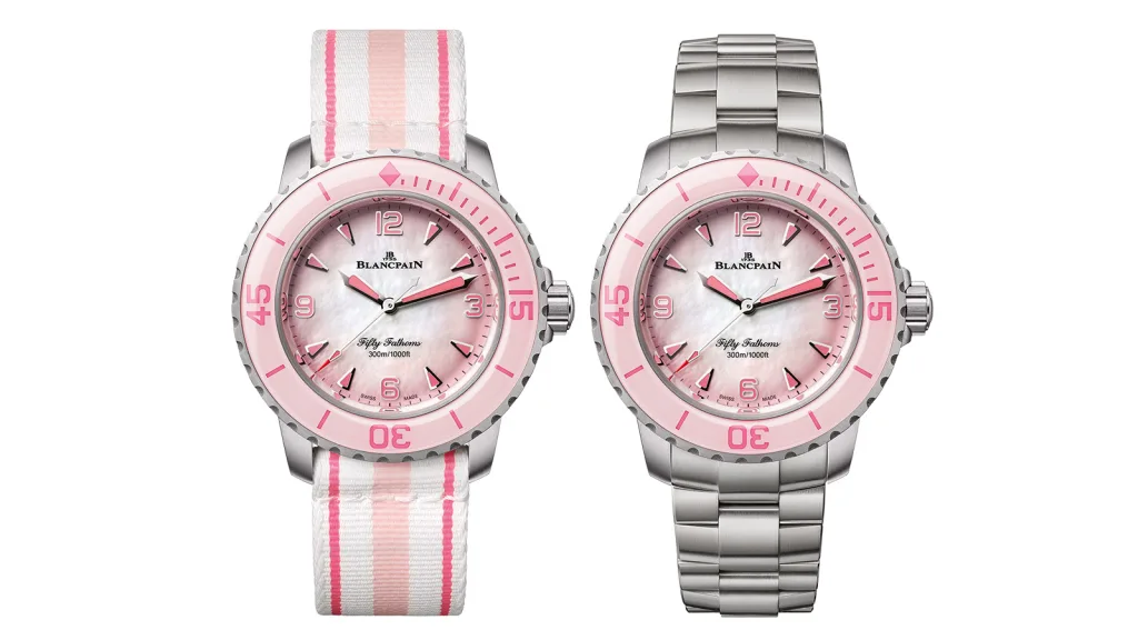 Blancpain has rolled out a fresh pair of Fifty Fathoms Automatique models and this time they’re playing in a more compact sandbox; delivering one model in smoky black with a red gold case and another draped in petal pink housed in titanium.