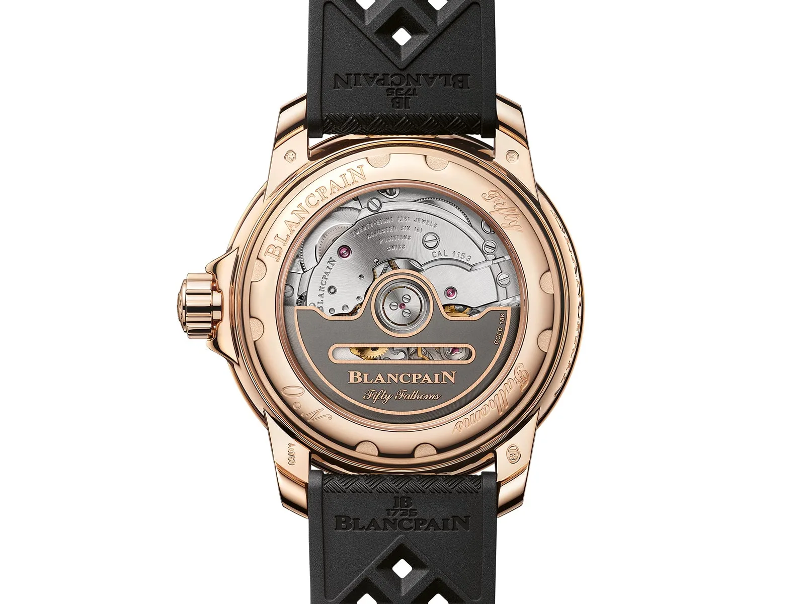 Inside beats Blancpain’s own manufacture Calibre 1153. Running at 3 Hz with a hefty 100h power reserve, it’s equipped with a silicon balance spring for better accuracy and magnetic resistance. A red gold rotor treated with Nickel Anthracite Coating peeks through the exhibition caseback.