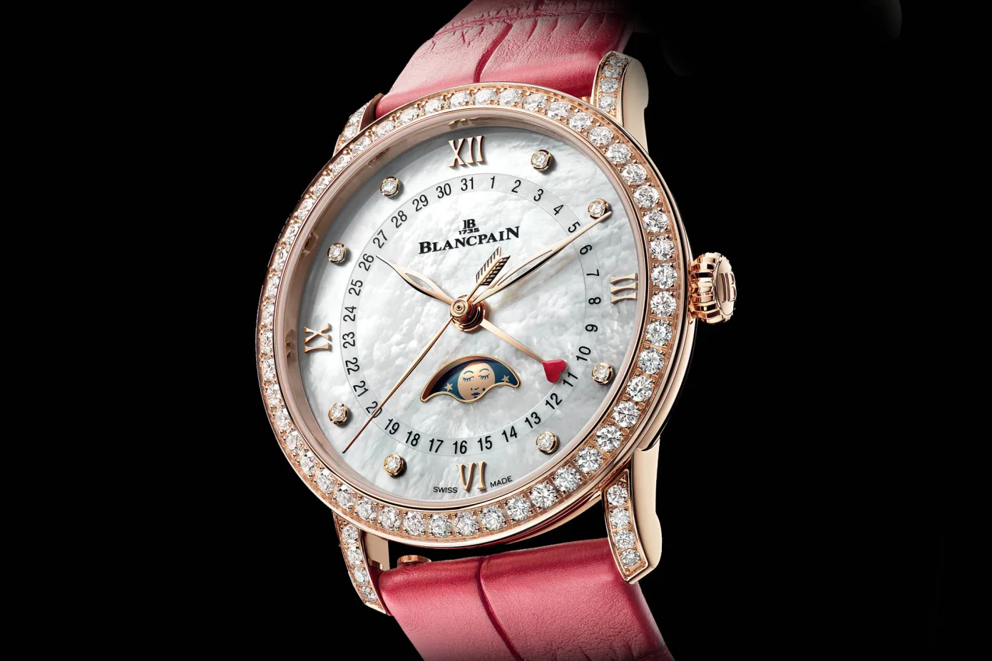 The Blancpain Villeret Women Quantième Phases de Lune: Valentine’s Day 2019 Edition is paired with two interchangeable alligator leather straps. Its lucky owners will thus be able to switch from flaming red to pristine white simply by pressing the functional catches located beneath the straps. Visit Blancpain here.