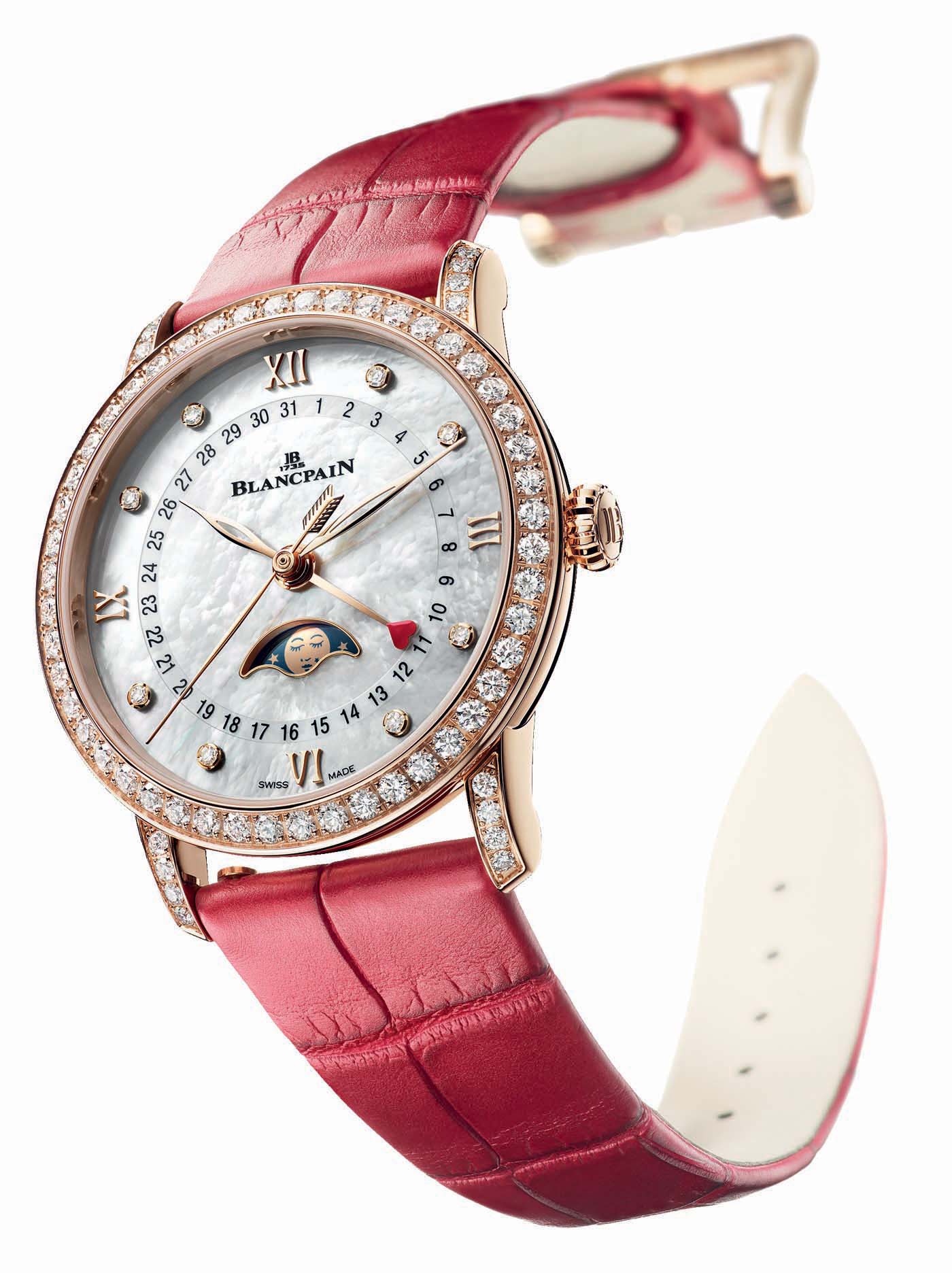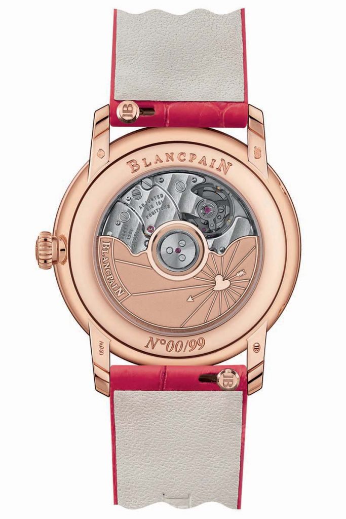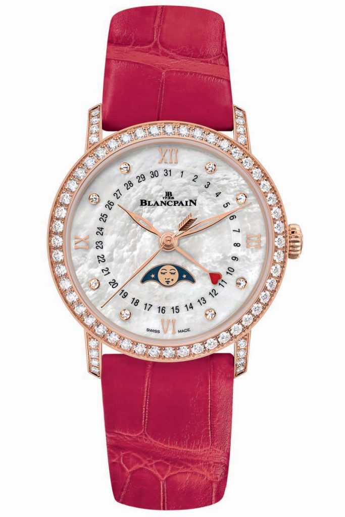 The Blancpain Villeret Women Quantième Phases de Lune: Valentine’s Day 2019 Edition is paired with two interchangeable alligator leather straps. Its lucky owners will thus be able to switch from flaming red to pristine white simply by pressing the functional catches located beneath the straps. Visit Blancpain here.