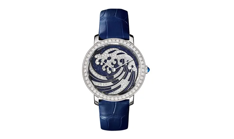 If you haven’t guessed by now, waves are the theme of this watch. Specifically, one huge wave made of round and baguette cut diamonds adorning the dial of this lovely timepiece. The dial has been made in such a way as to give the wave the third eye-catching dimension. The watch has also been given a new colour for Only Watch, the coloured parts of the dial and the leather strap have been given a playful blue colour which “interprets the naturalism so dear to Maison Boucheron”. The beautiful dial of this piece is protected by aventurine glass, which is also known by the name goldstone, it can be very difficult to work with.