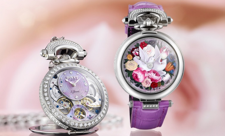 The design theme is inspired by the universal message of peace and hope whilst honouring women, who give life and protect children and represent the future. Thanks to its reversibility, this piece presents two amazing faces. The front of the watch features a diamond-set pink mother-of-pearl guilloche dial at 12 with hours and minutes indicator, a small second counter at 6 O’clock, and the power reserve indicator at 9 while the back displays a pink mother-of-pearl dial with a miniature painting of a pair of doves surrounded by colourful flowers. This painting is a reproduction of the grand feu enamel case back of a Bovet pocket watch that was manufactured at the turn of the 19th century. The crown and strap bolts are set with 5 briolette diamonds, complimented by a purple alligator strap and white gold buckle.
