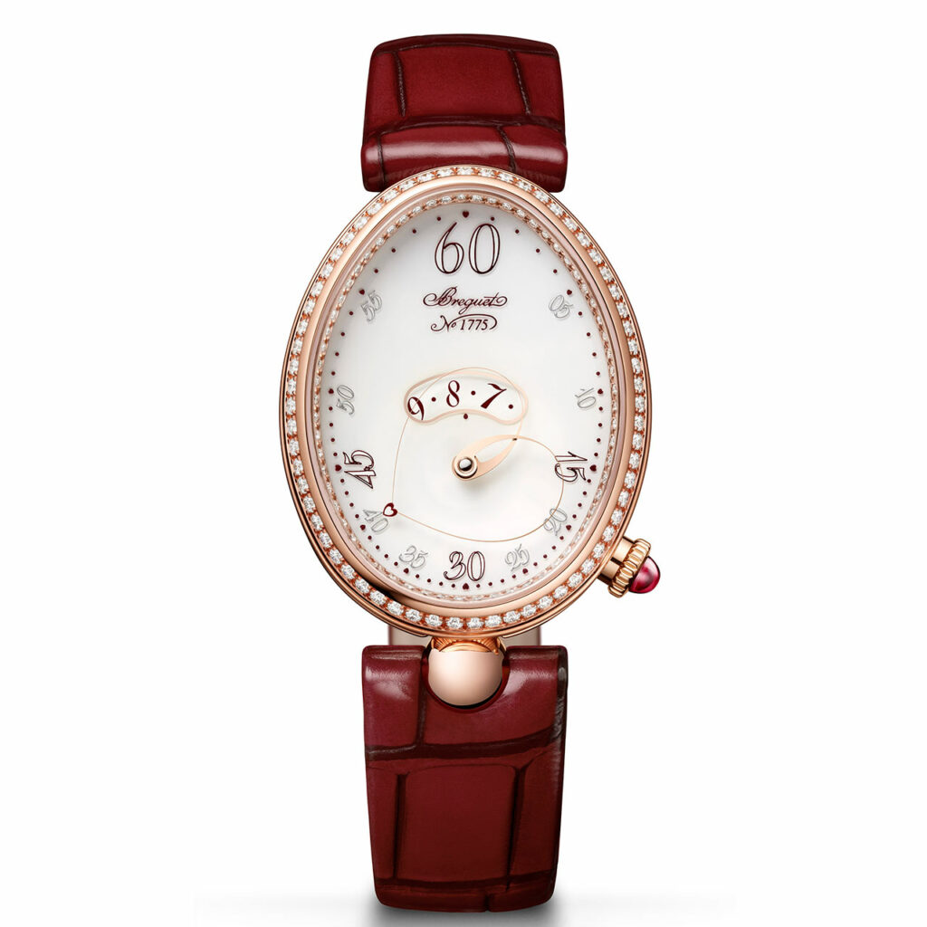 The white lacquer dial is a real stand out. It features large Breguet numerals which add to the historic appeal of the watch. A cutout at the centre of the dial indicates the hours via a disk, while the minutes are shown via a very special heart-shaped hand. Due to the dial’s irregular shape, a pair of normal boring hands wouldn’t cover the entirety. In other Reine de Naples models that’s not an issue as Breguet makes the most of the unique design.