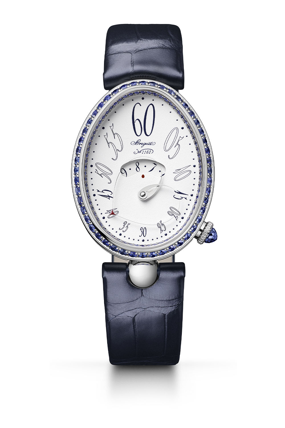 Reference 9835BB/5Y/964 DD0D has a midnight blue-coloured mother-of-pearl dial with a gentle gradient colouration. Its white gold bezel, lugs and flange are adorned with 161 diamonds, the crown features a briolette-cut diamond, and the clasp has diamonds on it too. Meanwhile, reference 9838BB/B8/364 S00S features a bezel, crown and clasp set with sapphires which contrast the white gold case and white dial beautifully, the lug at 6 O’clock is simply polished with this watch. This version also has more writing on the dial to give it character and another difference from the other version.