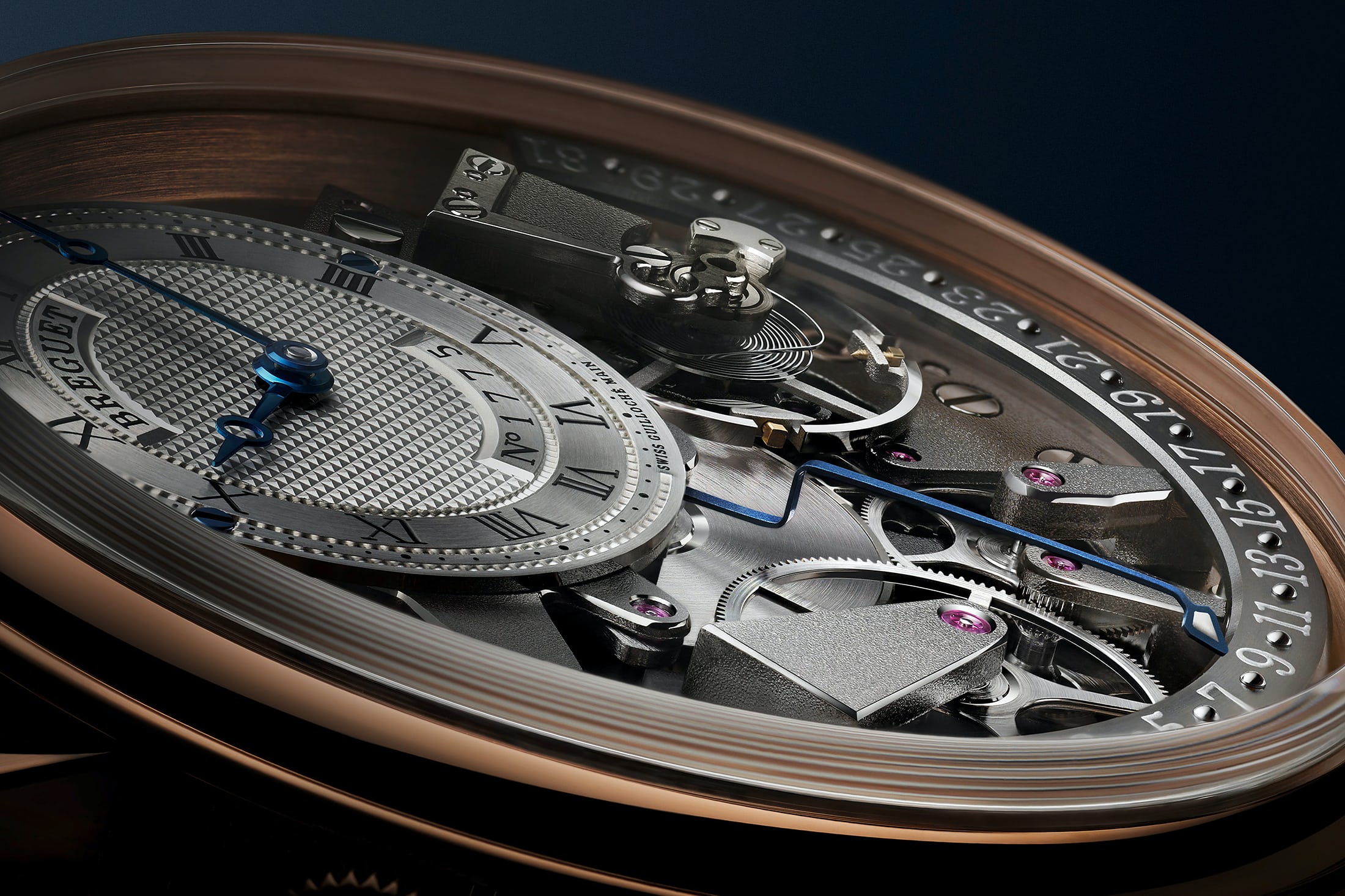Luckily, Breguet has succeeded. The mechanism for the date is sat low down in the watch, so Breguet had to bend its heat-blued steel hand to allow it to pass over the balance wheel and gear train without collision, and there’s a pusher at 10 o’clock to allow you to set the date quickly and easily.