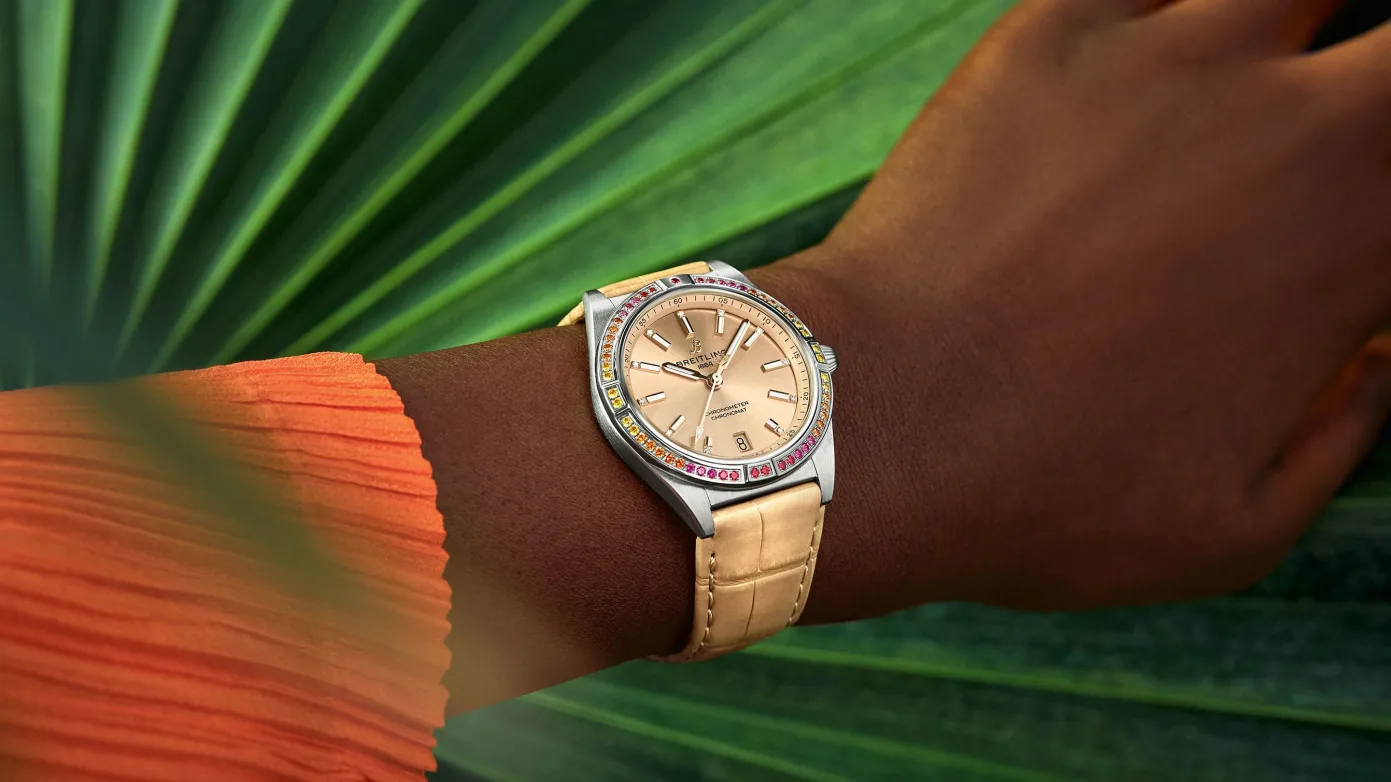 Presented in vivid shades of blue and green and a warm tone of Beige, the dials of the new Chronomat Capsule South Sea watches evoke a nice summery vibe. And while the dials look lively and refreshing, what makes these watches truly vibrant are the multicolored diamonds set within the fixed bezel on top. Like other members of the Chronomat 36 family, these new watches continue to exhibit maturity in design and functionality, which is not always the case with women’s watches. The applied golden lume filled hour markers, the printed minute chapter ring on the rehaut, the date window at 6, and the well-proportioned hands combine to form a face, that is attractive but also highly legible.