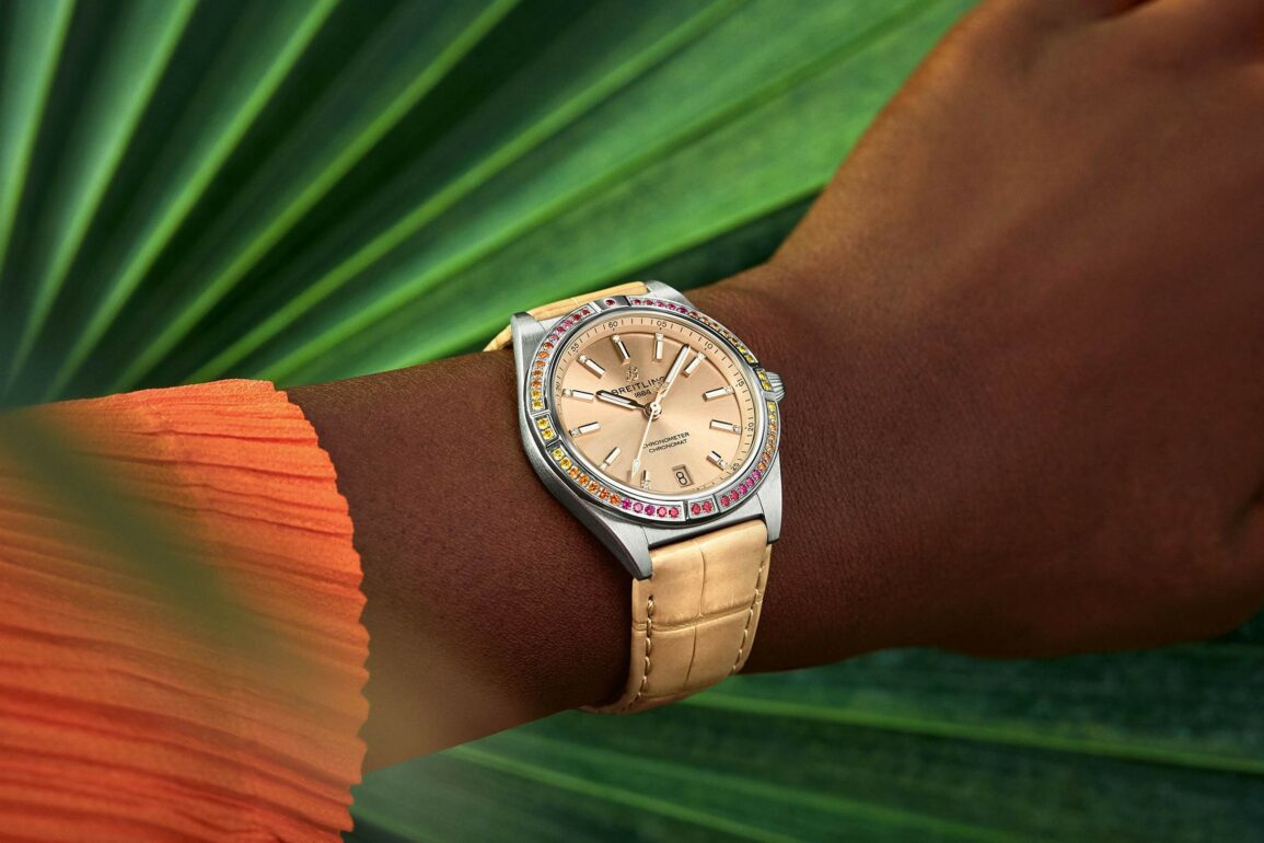 Presented in vivid shades of blue and green and a warm tone of Beige, the dials of the new Chronomat Capsule South Sea watches evoke a nice summery vibe. And while the dials look lively and refreshing, what makes these watches truly vibrant are the multicolored diamonds set within the fixed bezel on top. Like other members of the Chronomat 36 family, these new watches continue to exhibit maturity in design and functionality, which is not always the case with women’s watches. The applied golden lume filled hour markers, the printed minute chapter ring on the rehaut, the date window at 6, and the well-proportioned hands combine to form a face, that is attractive but also highly legible.