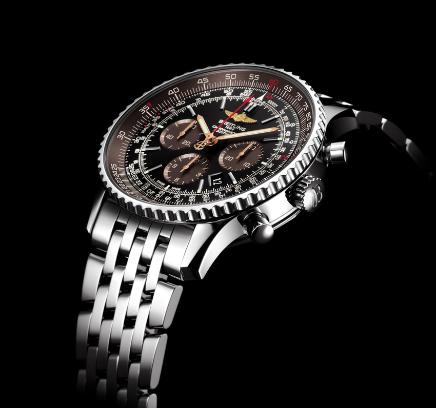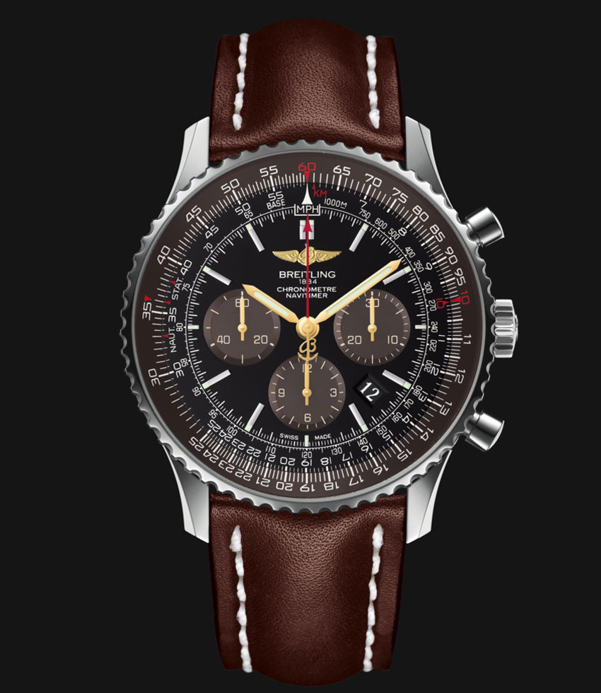 Today’s latest interpretation is the pilot’s cult model, which basically means that the watch maker added a black and brown dial with gold-toned hands. The case is completely silver in color, made of stainless steel. Three brown-colored timers, or counters can be found on the face of the watch, each one measuring either seconds, hours, and minutes. Each of the three dials has a gold-toned hand to match. The counters on the side of the watch are accented in that same gold color and have white colored lettering to match the piece. The Breitling logo, the word “Breitling,” the origin year of the company (1884), and the words “Chronometre” and “Navitimer” can all be found on the face under the 12 ‘o clock marking.