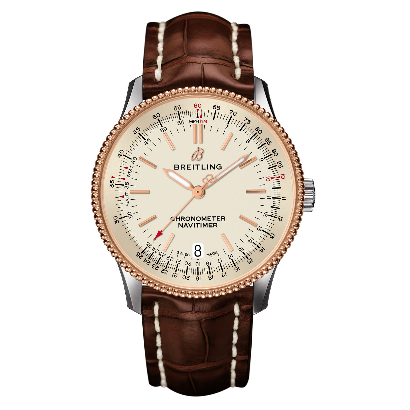 This one takes many lessons from its older counterparts. Despite having no chronograph function, it has a rotating aviation rule paired with beads of rice style bezel that is reminiscent of the early generations of the Navitimer 806. The case measures in at a mere 38mm, quite small for a Breitling, right? This is obviously intended to be a dress watch, yet has some design cues and a few quirks of things from the older catalogs of Breitling. It presents a sleek and refined case shape along with a clean dial that isn’t painful to stare at.