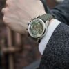 The next model pays tribute to the Curtiss-Wright P-40 Warhawk. If you were in the Royal Air Force or the Soviet Air Forces, you’ll have known these as the Tomahawk or Kittyhawk, they were the first Allied planes to have the shark-like teeth under the front, mimicking markings seen on the Messerschmitt Bf 110. This watch comes with a military green dial with white subdials and red accents. It’ll also cost you $10,100.