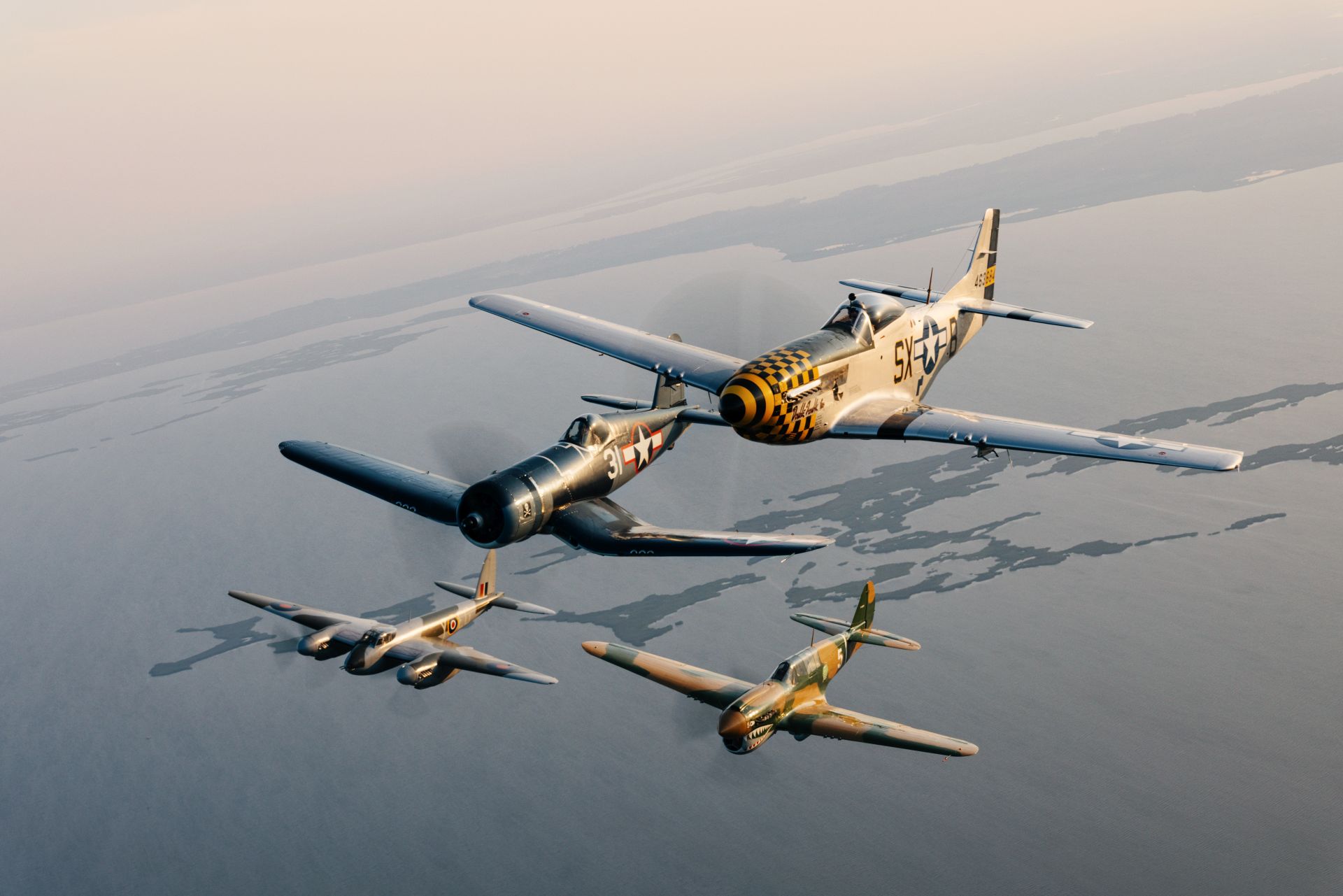 Four legendary planes: the de Havilland Mosquito (bottom left), the Vought F4U Corsair (top left), the Curtiss P-40 Warhawk (bottom right) and the P-51 Mustang (top right)