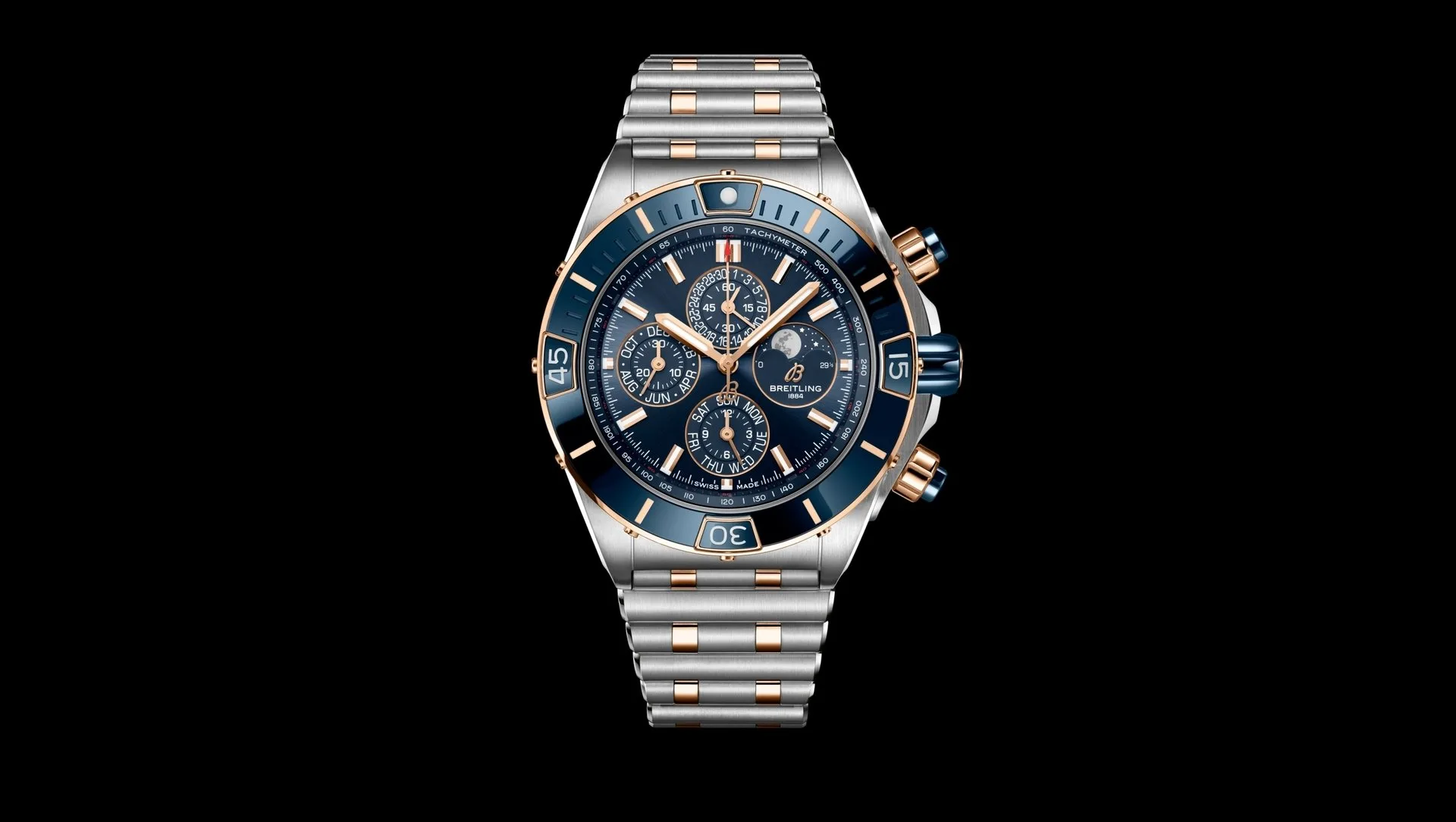 Perhaps the more interesting version of the new Super Chronomatis the Super Chronomat 44 Four-Year Calendar. It ups the ante and provides a genuine competitor to Omega’s Speedmaster Moonphase. The Four-Year Calendar watch doesn’t need adjusting until a leap-year rolls around, meaning it’s less complex than the perpetual calendar (which needs no adjustment) and the annual calendar (which needs changing once a year on the 29th of February).Â