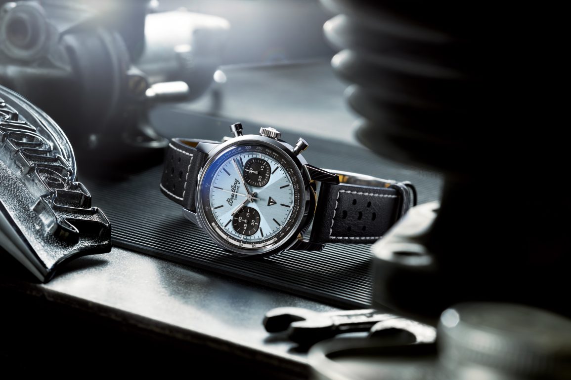 The watch pair are differentiated by a subtle difference in the dial design. Both are sunray ice-blue with twin sub-dials at 3 and 9 o’clock, but one has the classic “Zorro” shade that frames the sub-dials in the lighter portion. The color has two relevant references – a 1951 blue Triumph Thunderbird 6T and a 1970s ice-blue Breitling Top Time (Ref. 815). The sub-dials are a contrasting black with a 30-minute counter at 3 o’clock and small seconds at 9 o’clock, and the applied indices and outer tachymeter are also black. The dial shares branding between the two companies with Breitling at the top and Triumph’s logo at the bottom. A domed sapphire crystal with multiple anti-reflective coatings protects the dial, creating retro distortions at sharp angles like acrylic.