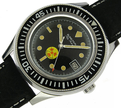 Finally, they got in contact with Blancpain, whose CEO Jean-Jaques Fiechter was an avid diver. He agreed to produce their watch. The first model was finished in 1953 and presented to the public in Basel the following year. The watch proved to be very robust and reliable and many other special forces soon began using it, among them the Spanish, Israeli, American, German and even Norwegian special forces. But military forces were not the only ones to use this watch. The two main suppliers of the Fifty Fathoms were Spirotechnique and Aqualung. Sprirotechnique was the official supplier of equipment for the French naval forces. Aqualung however was a supplier of diving gear, for civilians. Aqualung was the name of Jaques Cousteau’s line of diving equipment, and the Blancpain watches that were sold in his shop bore the name “Aqualung” on the dial. From early 1950 to 1970, more than 20 different variations of the Blancpain Fifty Fathoms were made. Among them is the “No radiation” dial, this one is rather interesting.