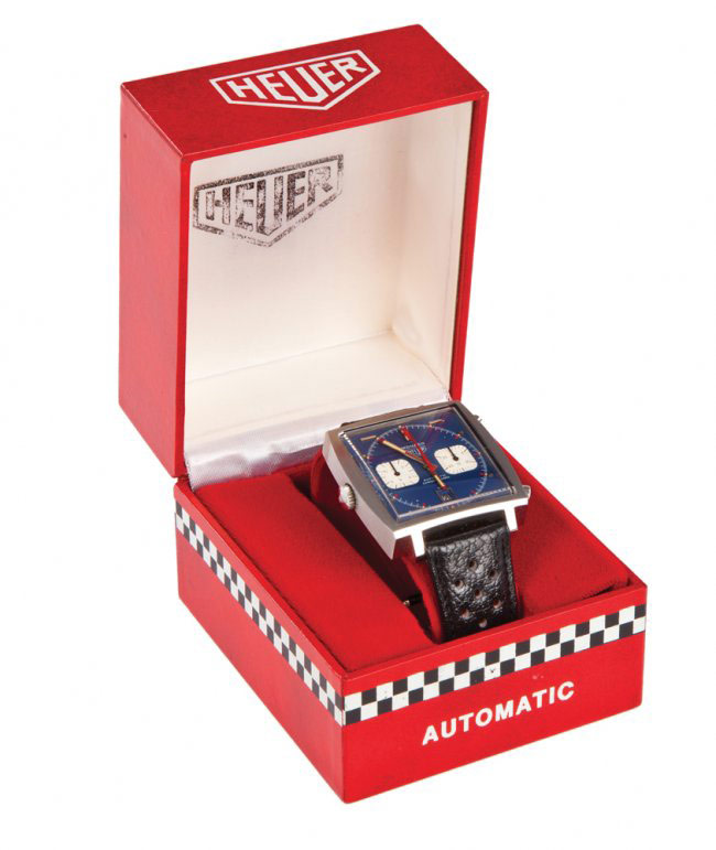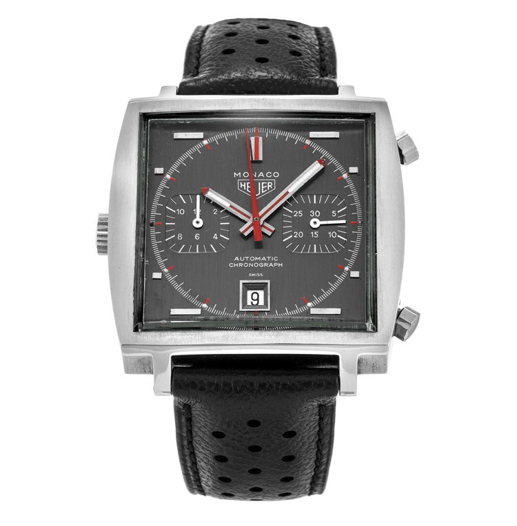 The very first Heuer Monaco was released at the Basel fair becoming the world’s first waterproof automatic chronograph with a square case (Jack Heuer chose the square case proposed by Erwin Piquerez, the owner of a large Swiss industry making watch cases). It retailed for US$ 200 with two models: reference 1133B and reference 1133G where B is Blue and G is Grey while the first two digits refer to the mounted calibre. The Monaco shook up the industry particularly the chronograph division with its unusual square case design and fully automatic movement that requires the wearer to only touch the crown for time setting.