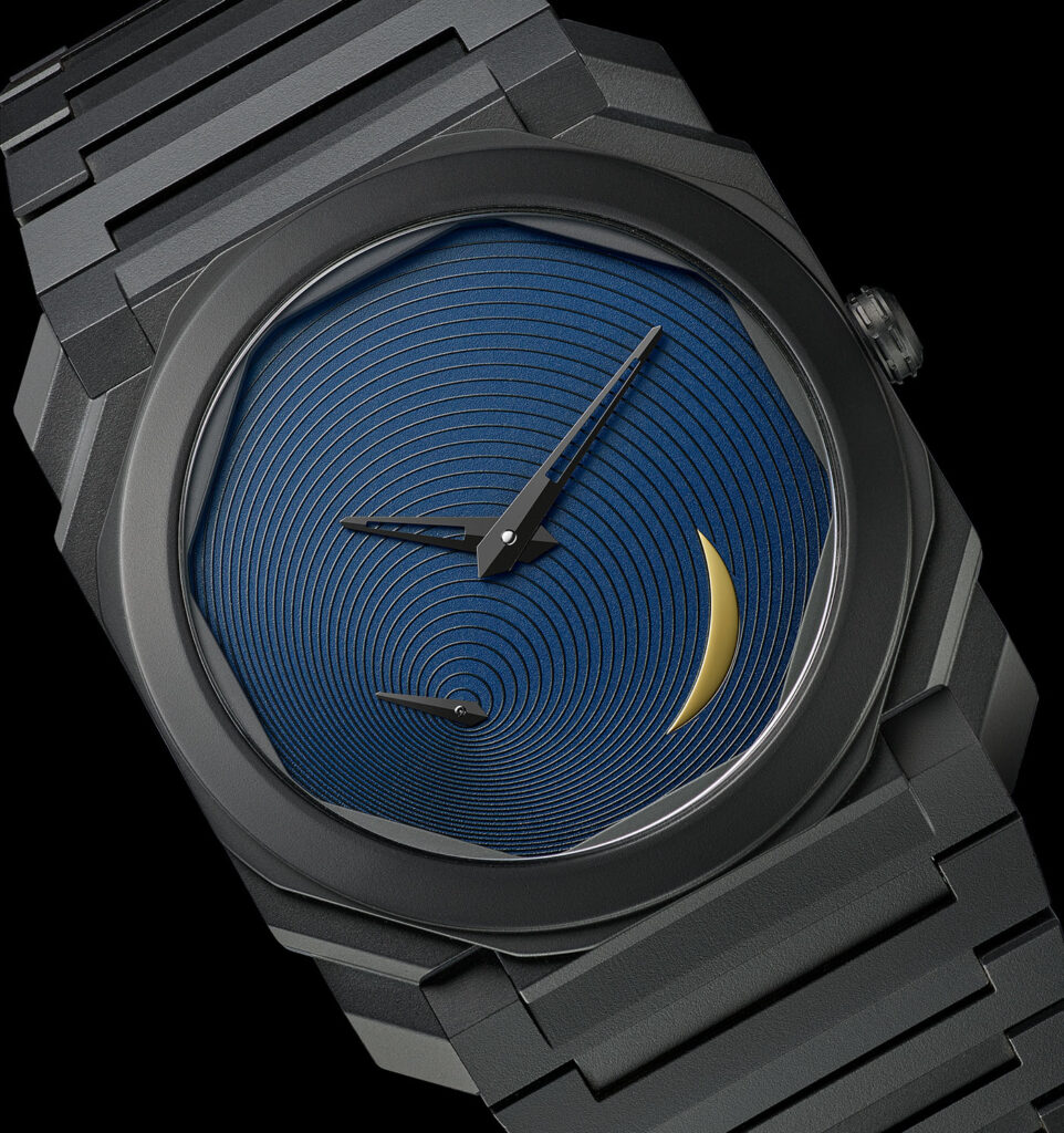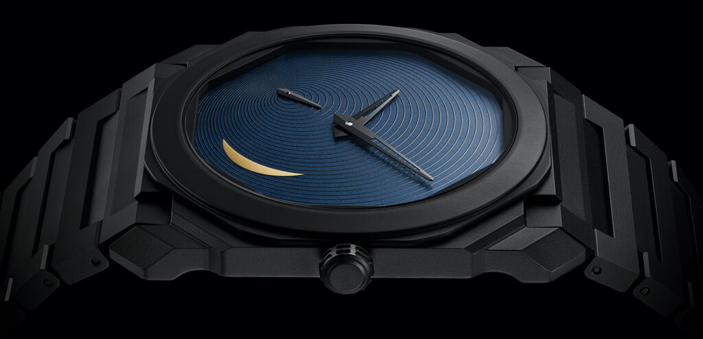 Premiering now at Watches and Wonders 2021 is the new Bulgari Octo Finissimo Tadao Ando, one of the most artful creations from a big brand at the show. The new Octo Finissimo balances a spiral with the moon, all based on a watch that is exciting and artful in its own way. It’s an excellent balance between the mystery of the moon and the sharp, definite angles of the octagonal case.