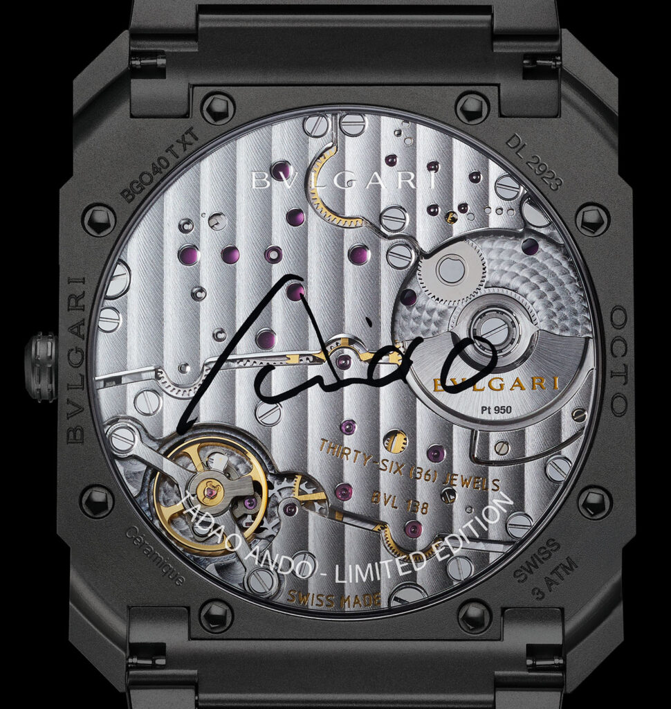 The movement under the crystal is the calibre BVL 138, an automatically-wound movement with a 60-hour power reserve and a full balance bridge. The real trick with this movement, though, is how thin it is. It measures in at 2.23mm thick, which could be seen as a tribute to Tadao Ando’s design philosophy of wasting no space and letting the right areas have meaning. Or it could just be really skinny.
