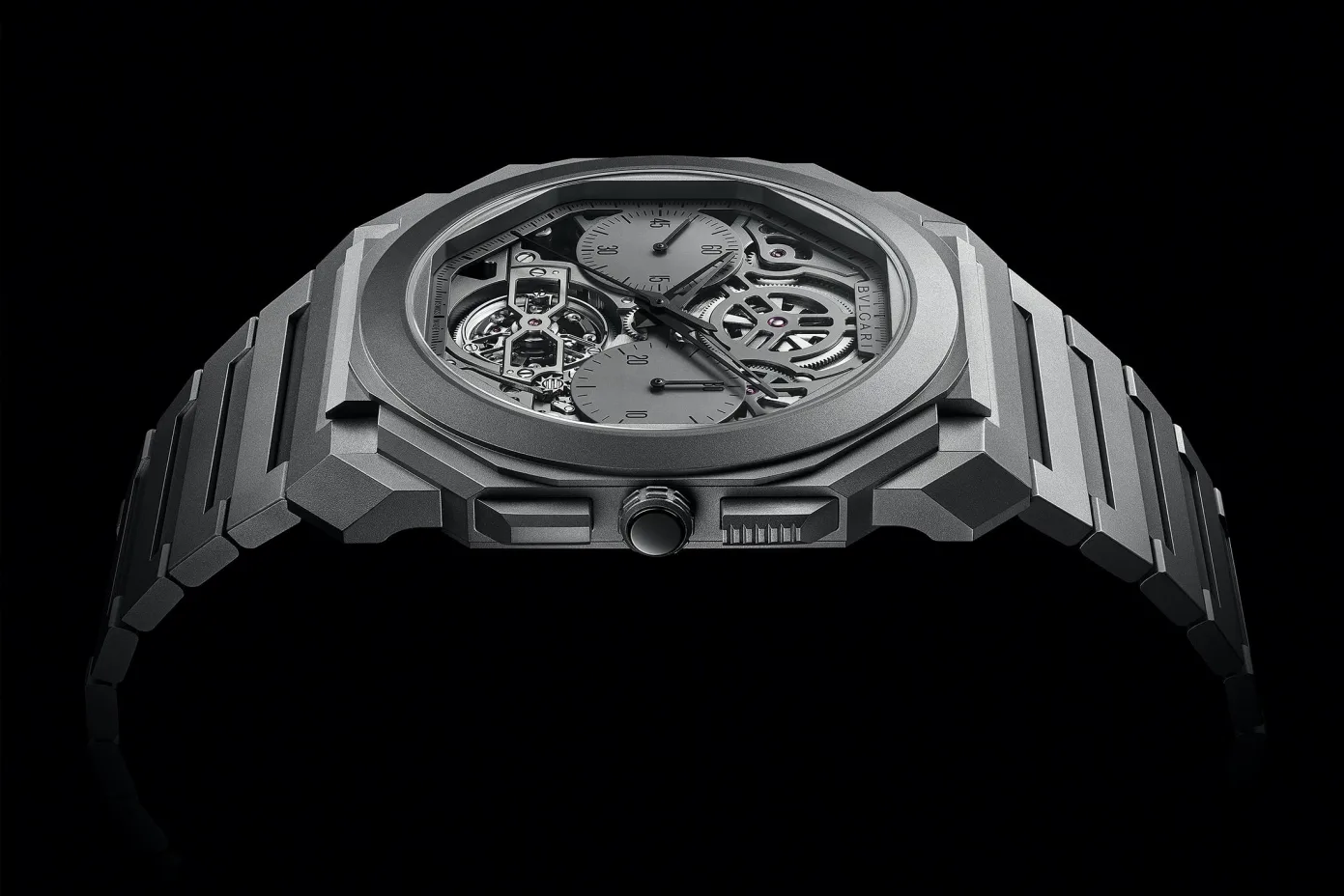 The new Octo Finissimo Tourbillon Chronograph is, as claimed by Bulgari, the world’s flattest tourbillon chronograph watch. The calibre BVL 388 measures just 3.5mm thick, but it’s still able to fit in those complications and a 50-hour power reserve. The entire watch is 7.4mm thick as well, but it’s quite wide at 42mm across. There’s plenty to see, as the dial is skeletonised so the calibre BVL 388 can be shown to the world.