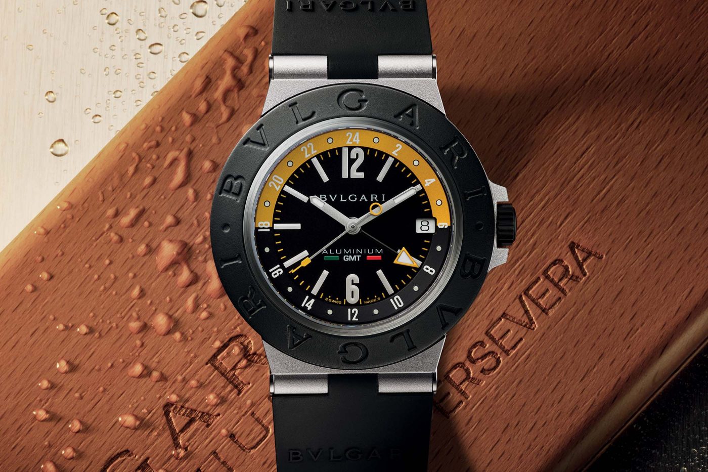 The colours of the ship, black with white and gold trim, translate onto the Bulgari well. The 40mm x 9.7mm aluminium case features a black Bulgari-branded rubber bezel. Also contrasting the silver aluminium case is a DLC-coated titanium crown. This and the caseback seal the watch to a maximum depth of 100m.