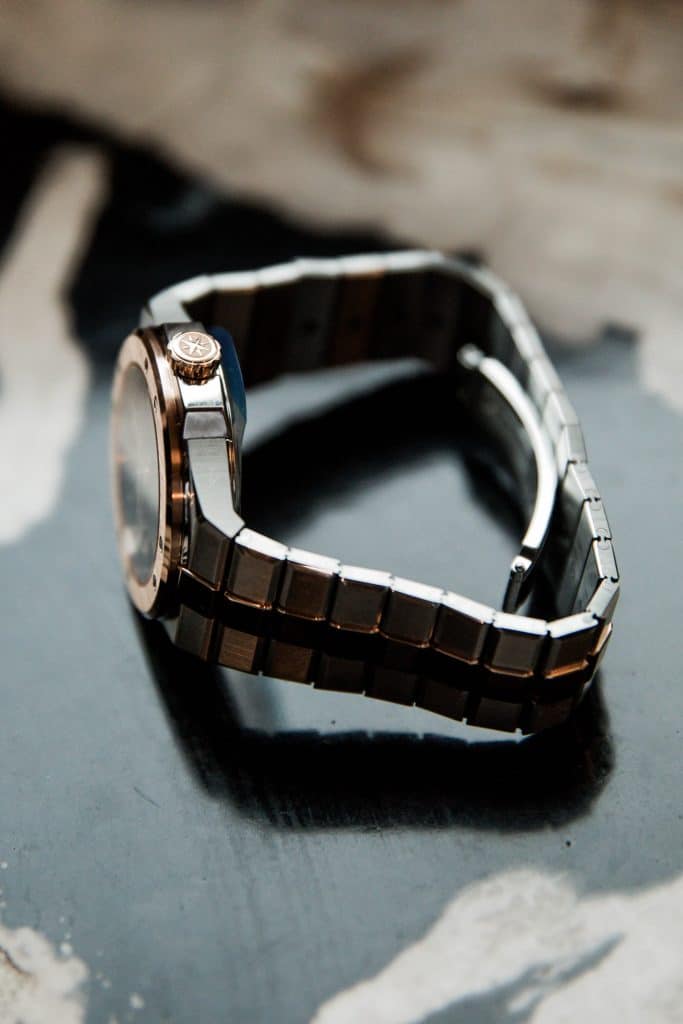 The bracelet of the Alpine Eagle is slightly tapered with a satin-brushed wide link and sides. It also has a single ingot-shaped link with a polished and gently raised centre link in the middle, thus creating a distinct design with its very own identity. The case features alternating satin-brushed and polished surfaces with eight polished screws – grouped in pairs at the four cardinal points – holding the bezel, case middle and back together. The screws, therefore, not only serve a technical purpose, but also serve an aesthetic purpose as the lines of the screw heads are perfectly aligned with the periphery of the dial and contrast with the satin-brushed surface of the bezel. Speaking about the case, it’s also distinguished by a protrusion protecting the winding crown, which has been engraved with a compass rose; an instrument that has helped adventurers find their way since ancient times. This subtle detail further emphasises the adventurous vibe that this collection oozes of – once you’ve gotten familiar with its origins.