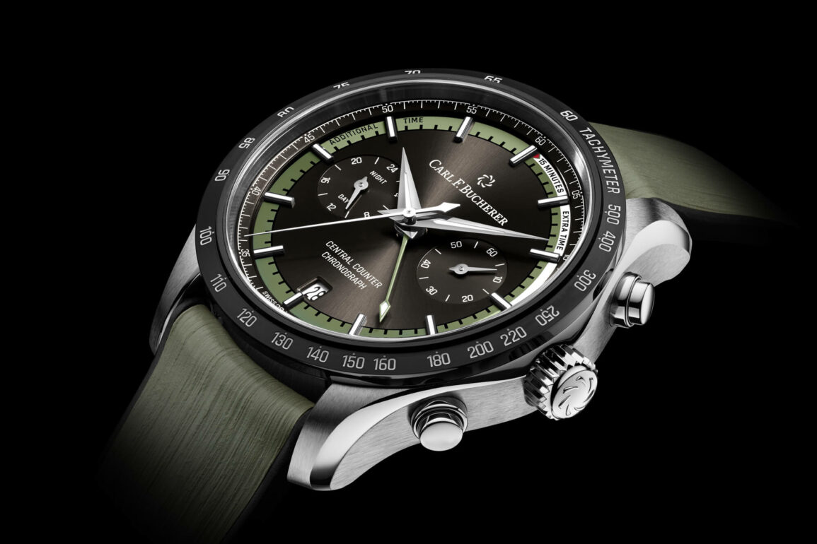 The Manero is a popular line from Carl F. Bucherer, and the new Manero Central Counter hopes to continue that popularity while introducing new themes to the collection. Carl F. Bucherer themselves say this is a “lifestyle-driven chronograph” watch, which explains the militaristic khaki colour of the strap and dial. Nevertheless, it’s still an example of a contemporary design done right, and I particularly like that they didn’t go overboard with the ‘lifestyle action man’ appearance. Although it does have a tachymeter bezel, a DLC-coated one at that, it’s fixed, so there aren’t any silly grips to accentuate it and make it bigger than it needs to be.