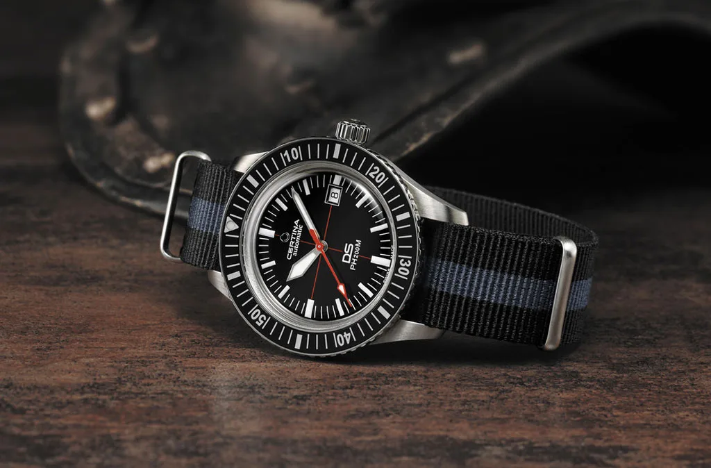 The DS PH200M features a stainless steel case with a 60 click black unidirectional bezel. The striking monochrome aesthetic is achieved via the black dial and white Super-LumiNova coated hands and indices. The contrast guarantees a highly legible dial enhanced by the coating that illuminates at night or deep in the ocean. Certina’s logo – the turtle – is engraved on the case back for a unique finish. Within the DS is the Swatch Group favourite ETA Powermatic 80 movement which has a date (at 3 o’clock) just like the original, and the famous 80 hours of power reserve. As we can see from the DS name, the watch is water resistant up to 200m. With the watch coming at 42.8 mm, it might not be suitable for smaller wrists, those with big wrists however would applicate the weight and heft that the DS has to offer. Fasten the DS PH200M with a black and grey striped Nato strap or a brown calfskin leather strap for a more formal occasion