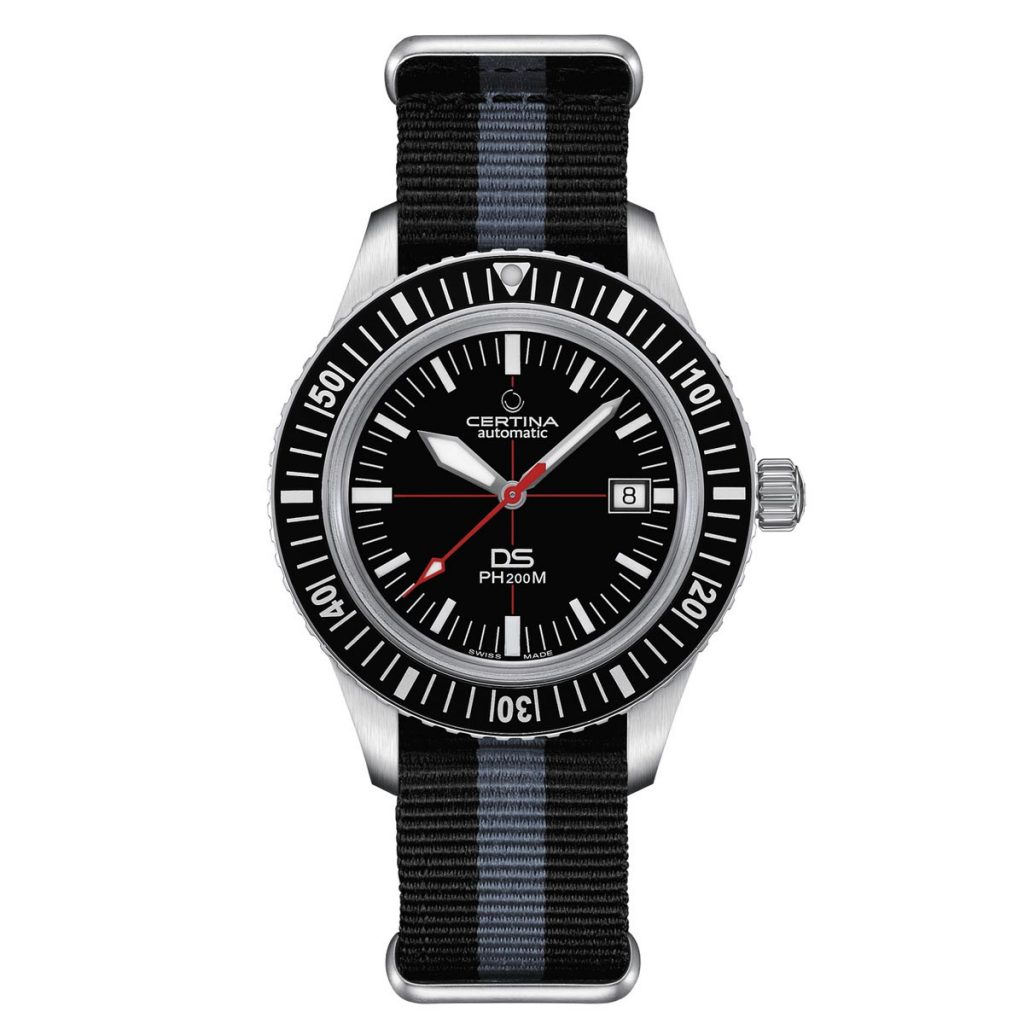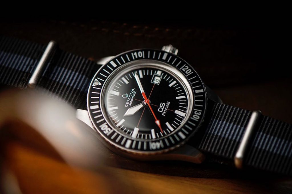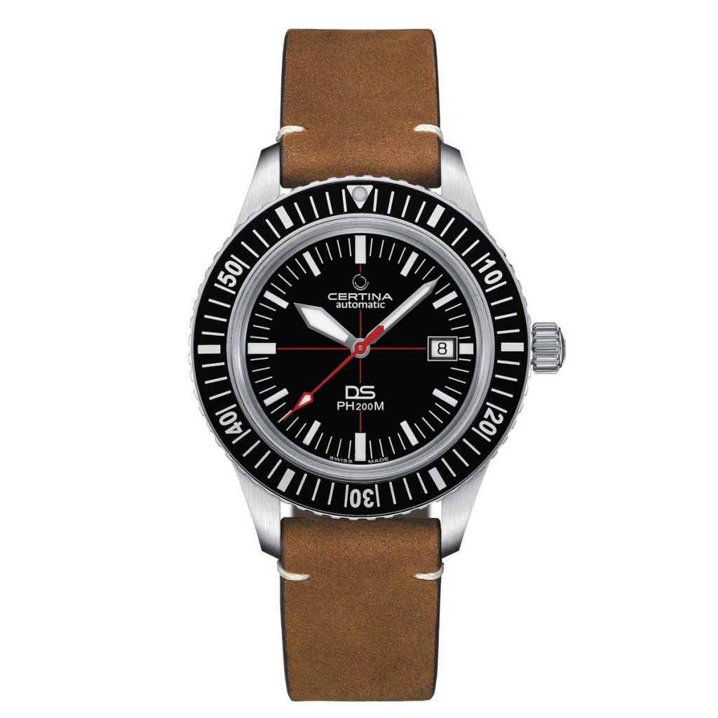The DS PH200M features a stainless steel case with a 60 click black unidirectional bezel. The striking monochrome aesthetic is achieved via the black dial and white Super-LumiNova coated hands and indices. The contrast guarantees a highly legible dial enhanced by the coating that illuminates at night or deep in the ocean. Certina’s logo – the turtle – is engraved on the case back for a unique finish. Within the DS is the Swatch Group favourite ETA Powermatic 80 movement which has a date (at 3 o’clock) just like the original, and the famous 80 hours of power reserve. As we can see from the DS name, the watch is water resistant up to 200m. With the watch coming at 42.8 mm, it might not be suitable for smaller wrists, those with big wrists however would applicate the weight and heft that the DS has to offer. Fasten the DS PH200M with a black and grey striped Nato strap or a brown calfskin leather strap for a more formal occasion