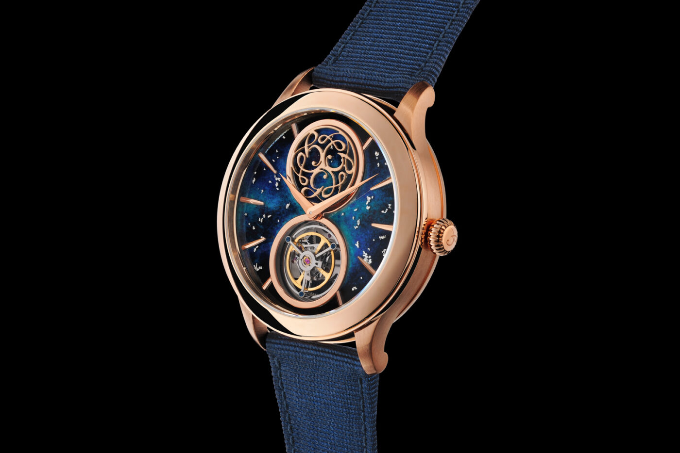 Inside the 41mm pink gold case is the CG1809/6 movement, a flying tourbillon movement with a peripheral rotor, another rarity in today’s world. There’s also elegant finishing, though it seems a little clean. I would’ve loved to see some excellent stripes. I can clearly see excellent bevelling on the edges, though, so it seems the movement has had plenty of attention put into its details.