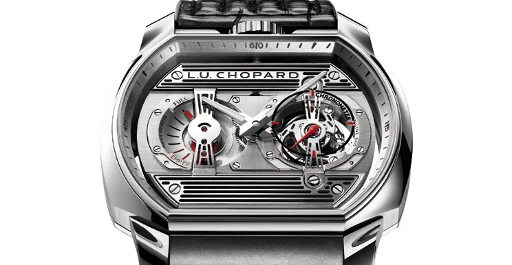 Designed and built by Chopard Manufacture in Fleurier, the movement of this timepiece bears the reference number L.U.C 04.02-L. The openings in its movement are a nod to the openworked design of a racing-car air intake. Engine-block cylinder heads inspired the grooves engraved on the dial-side bridges. For functional reasons, the latter are in fact an integral part of the main plate of the movement. The latter is visible from both sides of the “machine” through two flat sapphire crystal watch glasses. The interplay of polished and satin-brushed surfaces, the cut-off curves and the concave surfaces, combine to express a particularly sophisticated approach to design in both formal and ergonomic terms.