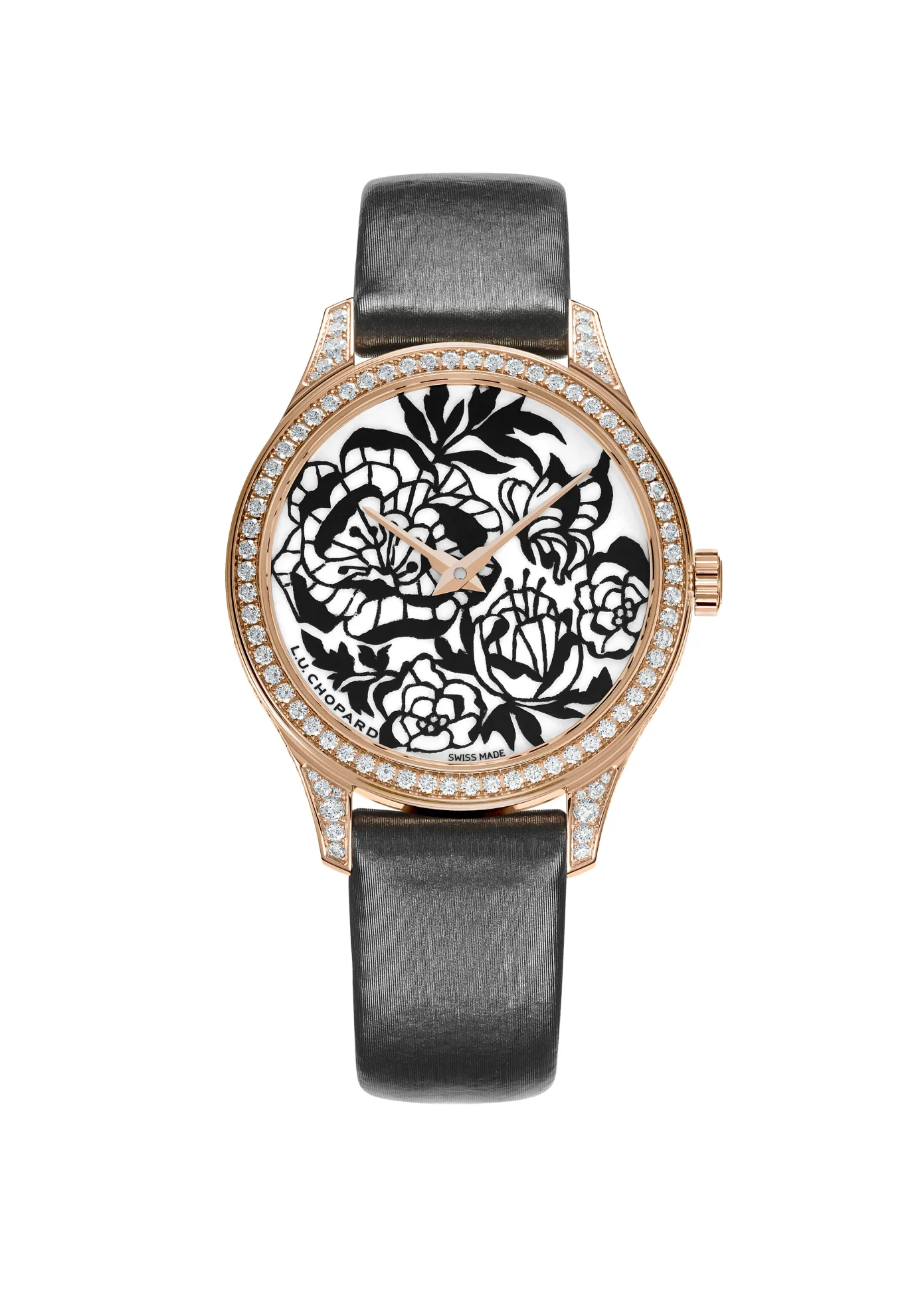 Balancing out the stark black and white of the dial is the 18K rose gold case, which we can assume will measure 35mm across the case, just like last year’s model. Adorning this are diamonds, quite a few of them in fact. There are 1.83 carats of white diamonds placed onto the bezel and sides of the case to accentuate the look (also, who doesn’t like a few diamonds on their ladies watch?).