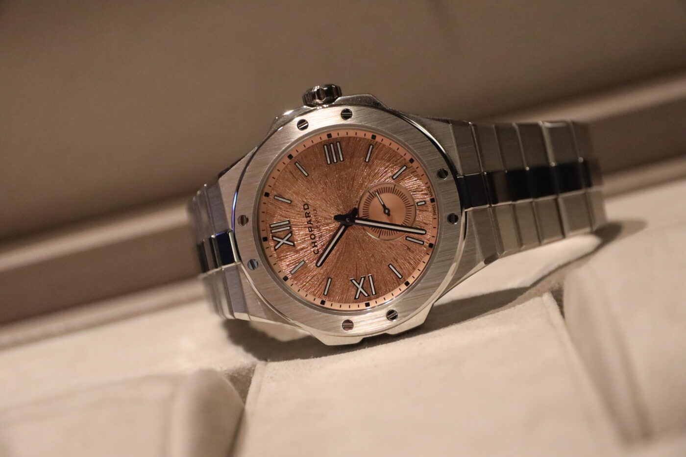 The solid gold micro-rotor and Geneva Seal finishing are hallmarks of Chopard’s watchmaking prowess. When Chopard originally announced the Alpine Eagle, this was more the watch I was expecting, as it is a luxury sports watch with an haute horlogerie movement which undercuts the competition by a large margin. Despite the fine striping on the movement and the small seconds hand on the salmon dial, this is still a go-anywhere sports watch, as the 100m water resistance shows. It’s a mightily impressive piece on the wrist too.