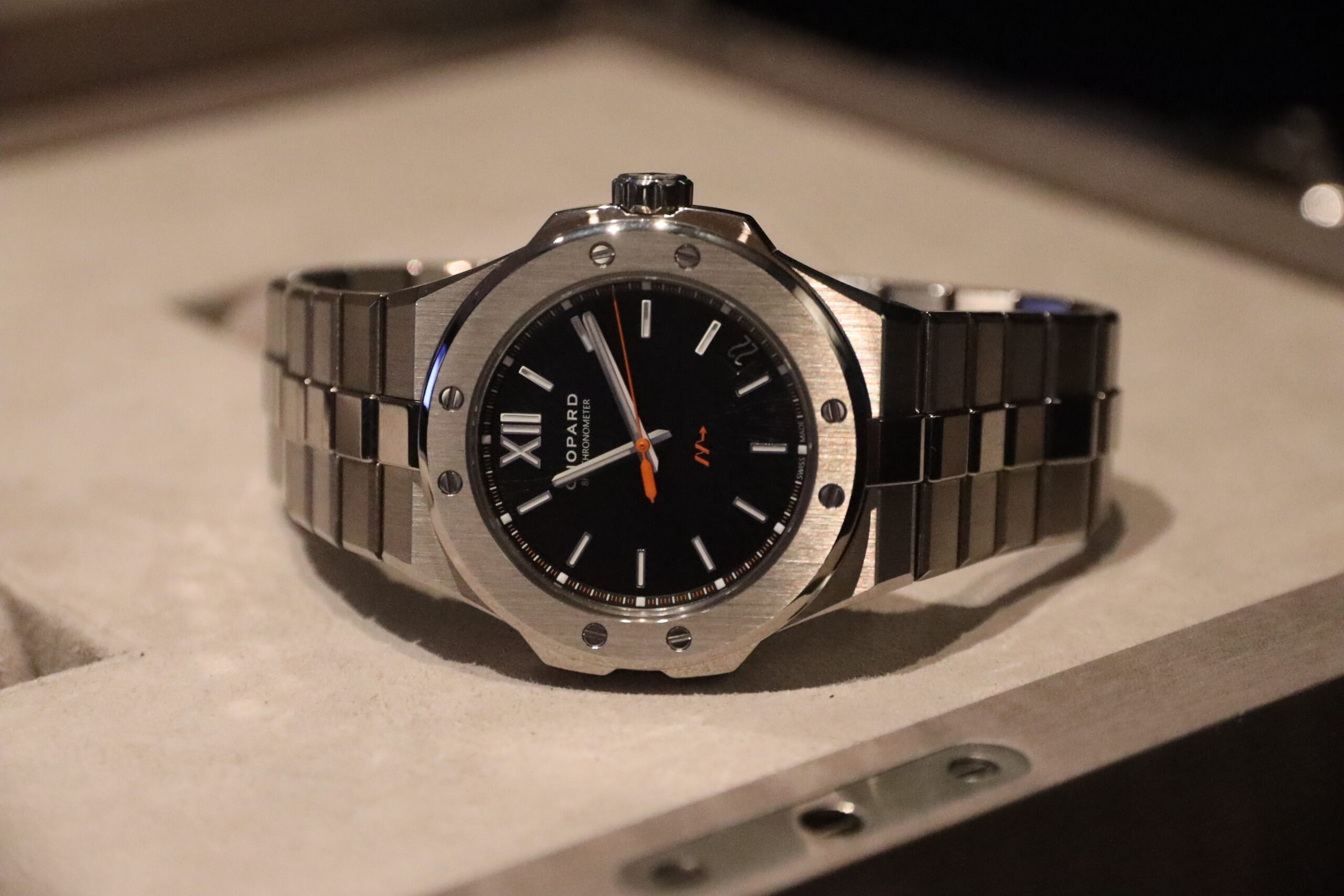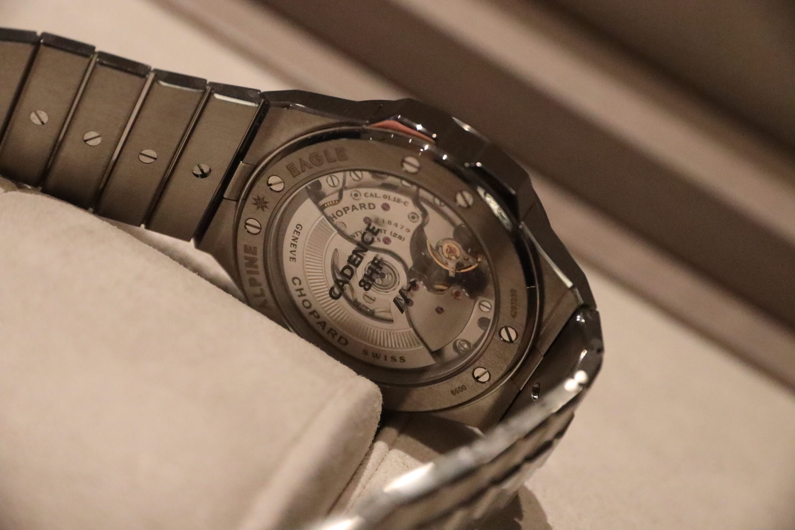 The first new watch shown to me was the Alpine Eagle Cadence 8HF ref. 298600-3020. The name Cadence refers to the movement that this watch uses, which has an unusual beat rate of 8Hz or double the industry standard beat rate. The aim of this is to improve accuracy, as there is less time for deviations to occur during each swing of the balance wheel. Chopard introduced its first 8Hz movement years ago but hasn’t done much with it, with the movement appearing in one other Alpine Eagle and one L.U.C watch from memory. That movement comes inside a light-yet-durable 41mm case with a jet-black dial and red seconds hand. Chopard hasn’t indicated that this is a limited edition watch, although I doubt production will be as high as the regular watches. The price is set at