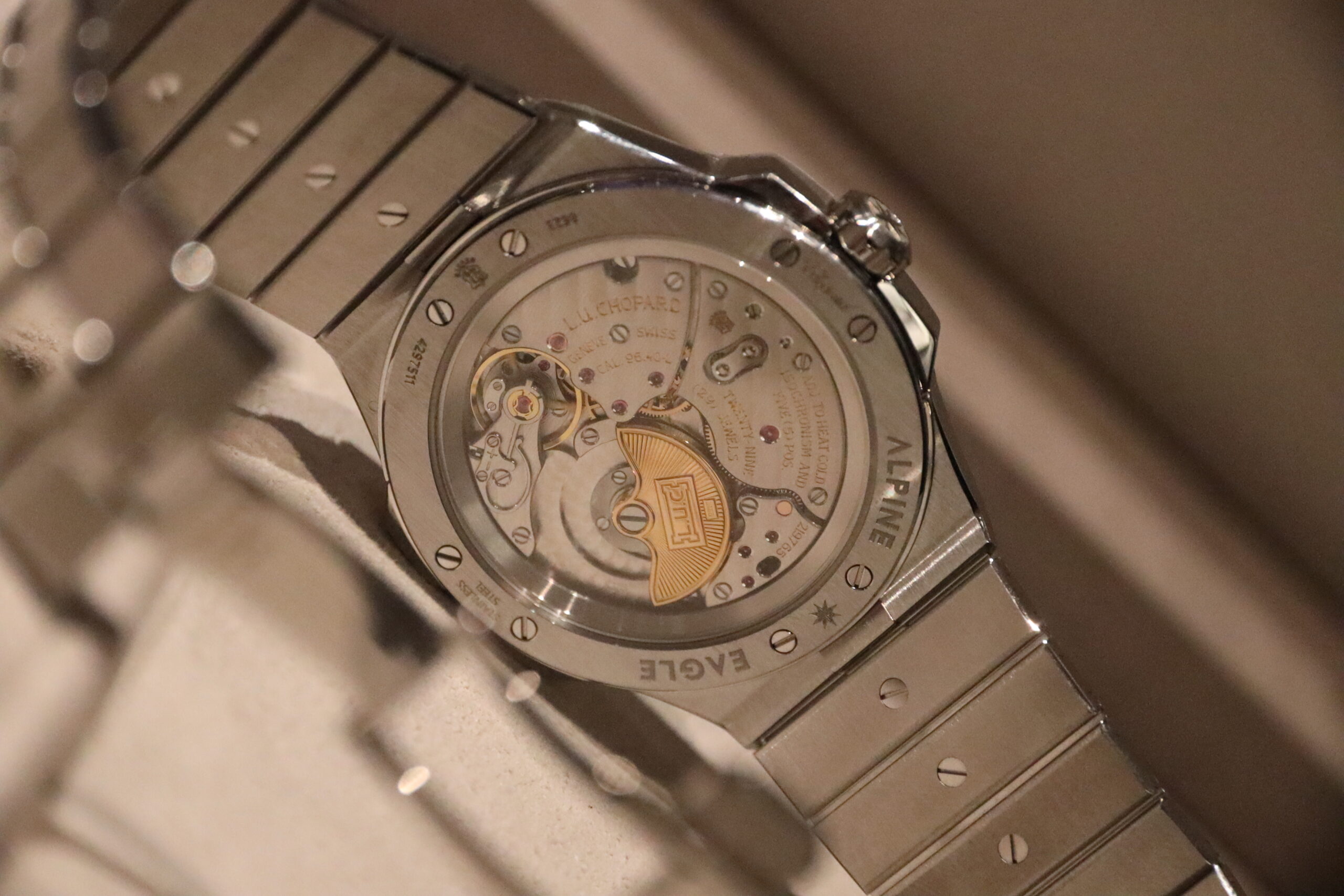 The other variant is the Alpine Eagle 41mm XPS ref. 298623-3001. Unlike the above watch, it has a case made of Lucent Steel A223, which, as we’ve covered before, is mostly made from recycled steel. It’s also got a lustre closer to gold than regular steel, thanks to its proprietary molecular structure and how it interacts with light. On the wrist, this is a very sparkly watch which, when you think about it, is one of the reasons we like these things. It has an L.U.C calibre in it for the first time in an Alpine Eagle, with the self-winding calibre 96.40-L taking pride of place behind a sapphire caseback.