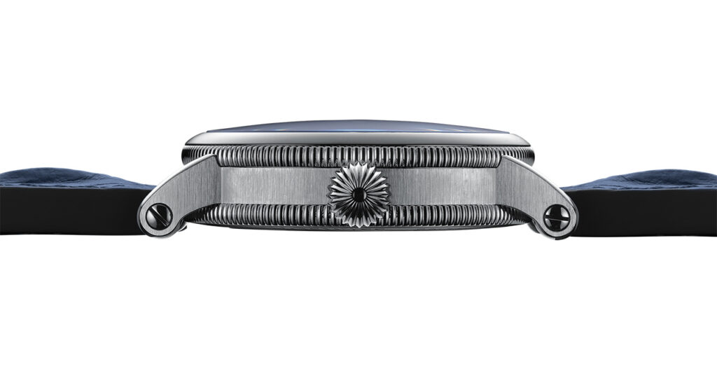 This watch’s dial is covered in guilloché with a wide ripple pattern that’s a deep blue. This guilloché was applied by hand using a rose lathe, the traditional equipment for applying guilloché, that’s over a century old.