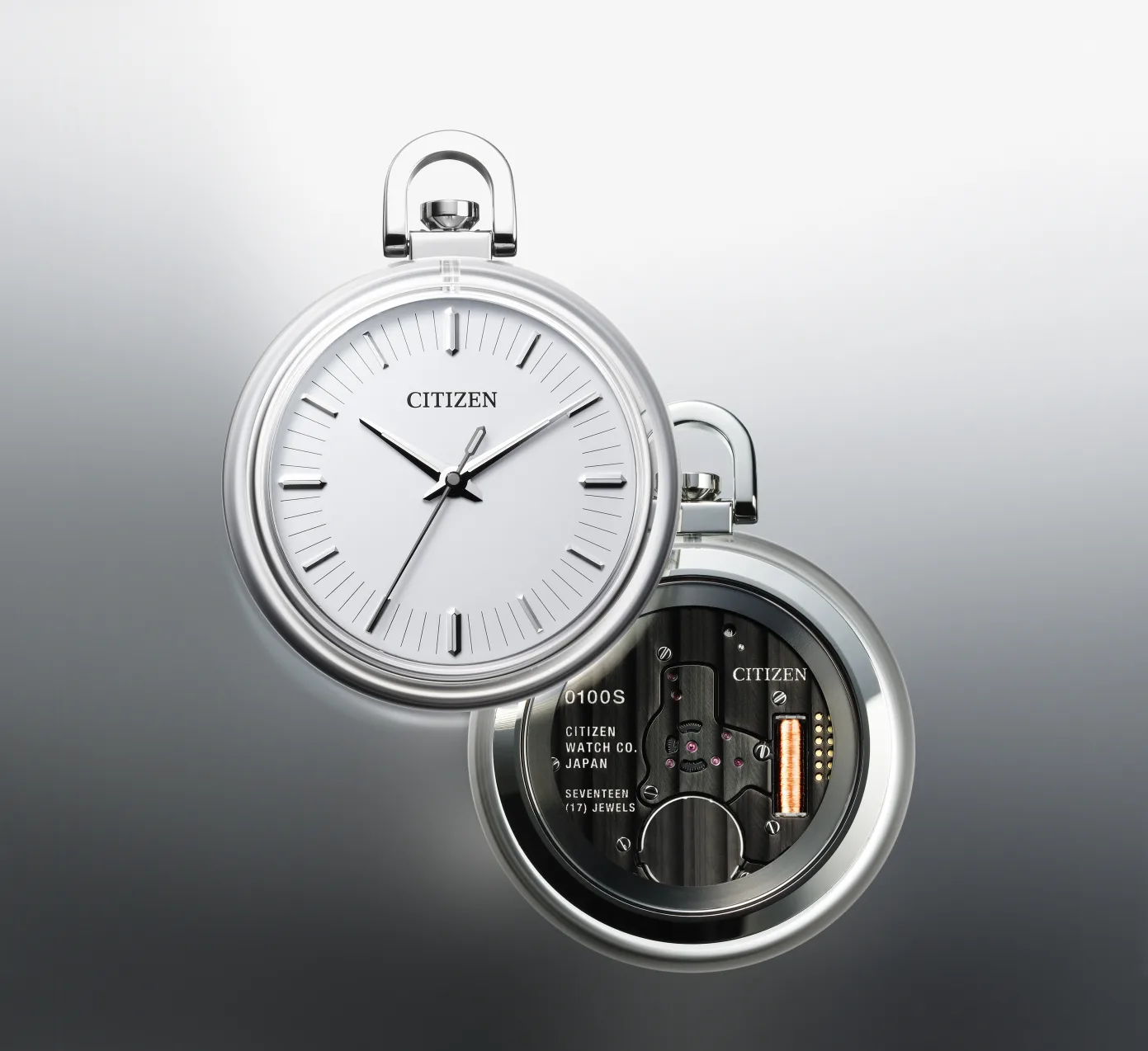 Now before you start planning on getting your hands on the next citizen watch that would come equipped with the Caliber0100, let me tell you that this movement is still in prototype phase and would only be able to make it to the mainstream market in the year 2019. But let us keep the availability part aside for now and have a look at how Citizen presented the prototype at Basel world this year. The Caliber0100 was showcased in a pocket watch style case which is made out of synthetic sapphire and even has an exhibition case back showing off the DLC treated movement. And just in typical pocket watch style fashion, there is a crown and a supporting handle at 12 giving the watch a nostalgic vibe.