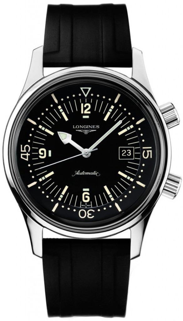 This model on a rubber strap still would be pretty hard to conceal, partly of course to the black rubber sports strap it’s equipped with, but also thanks to the very complex dial. A classic dress watch uses a minimalist approach to everything except movement decoration, a diver can’t make much use of a watch which gives no information other than the current time. The Longines dial includes a date window and hands and markers of Superluminova.