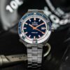 Your standard diving watch setup as seen on the Rolex Submariner, Omega Seamster (except for the Aqua Terra), Blancpain Fifty Fathoms and many others includes an external diving bezel. A diving bezel on a wristwatch is a sign that the watch is a professional tool piece that will withstand long periods of exposure to high pressure that you might experience as low as 20m down. The bezel can be used as a method of timing how long a dive is or how long left you have underwater. Depending on the breathing apparatus a normal scuba dive to, say, 30m down might leave you with about 20 minutes of time on the seabed with the rest of the time being used for controlled descent and ascent (believe me, it’s a very serious procedure when it comes to ascending from depth). The bezel adjusts in one direction on modern diving watches, it adjusts the “safe” way i.e. anticlockwise so as to ensure the bezel isn’t knocked forwards and risk loss of life because the diver didn’t notice. Some external diving bezels have extra systems to keep the bezel locked, such as the Omega Seamster Ploprof which has an extravagant locking system.